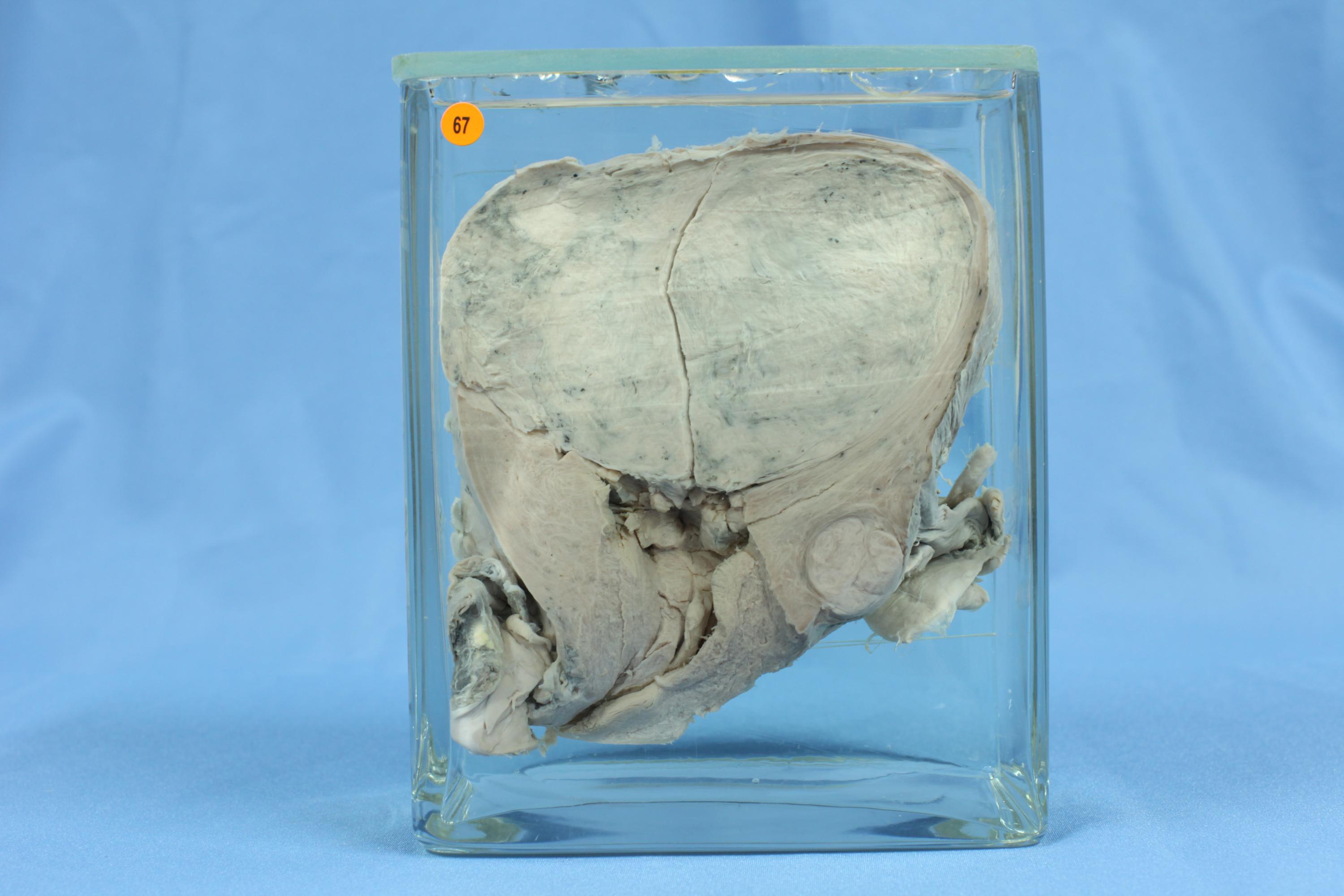 切开肿瘤,直径12cm。血管瘤切面呈蓝色点灶状,肿瘤被纤维组织分隔成小叶。