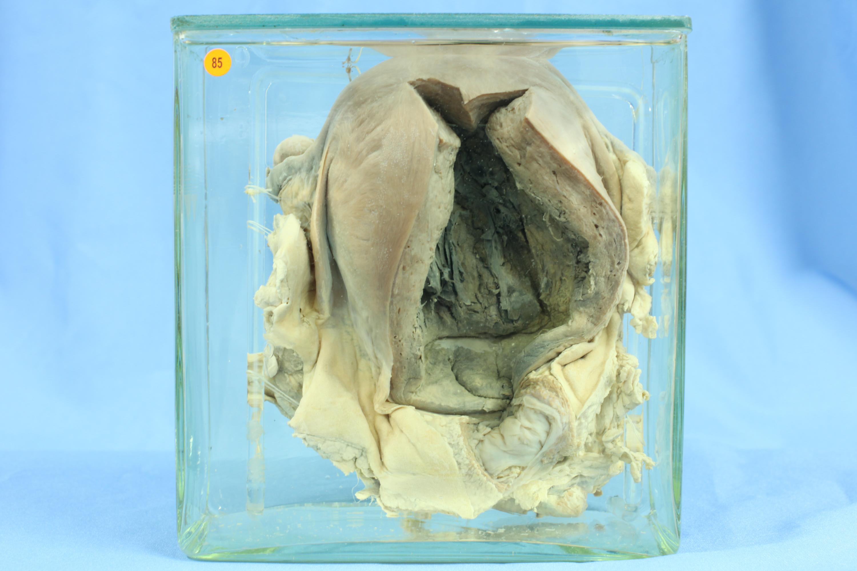 中央为切开子宫,大小17X8X7cm,子宫壁厚1.5cm。
