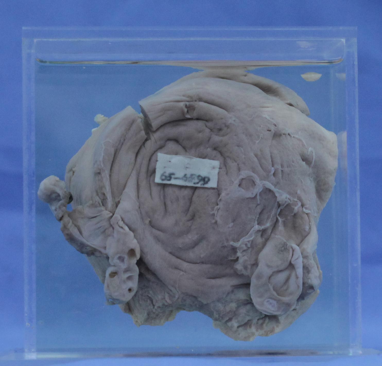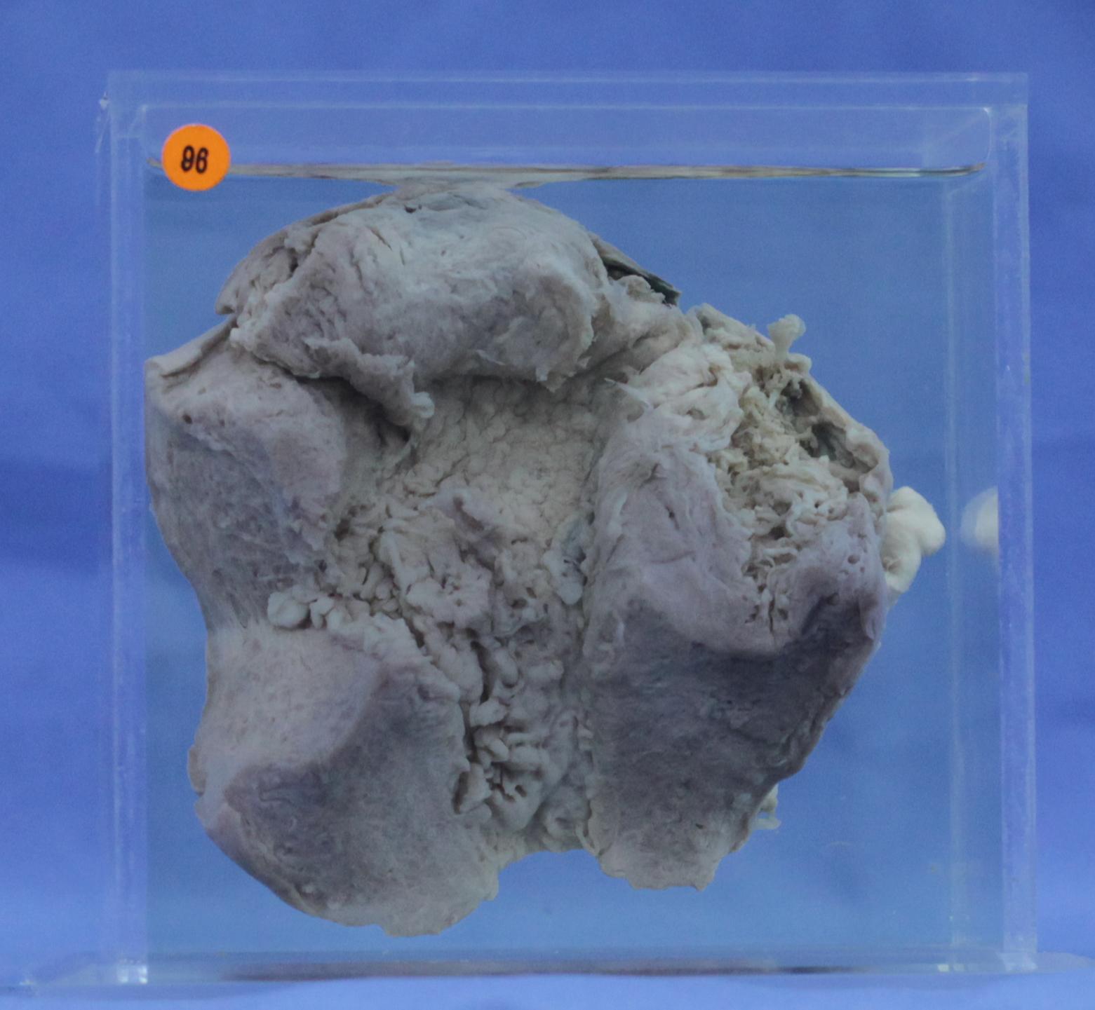 子宫肌壁一段,切面见子宫肌壁内有大小不等、深浅不同的水泡状组织侵入的病灶,子宫腔内可以找到原发病灶,绒毛可呈典型的水泡状胎块形态。