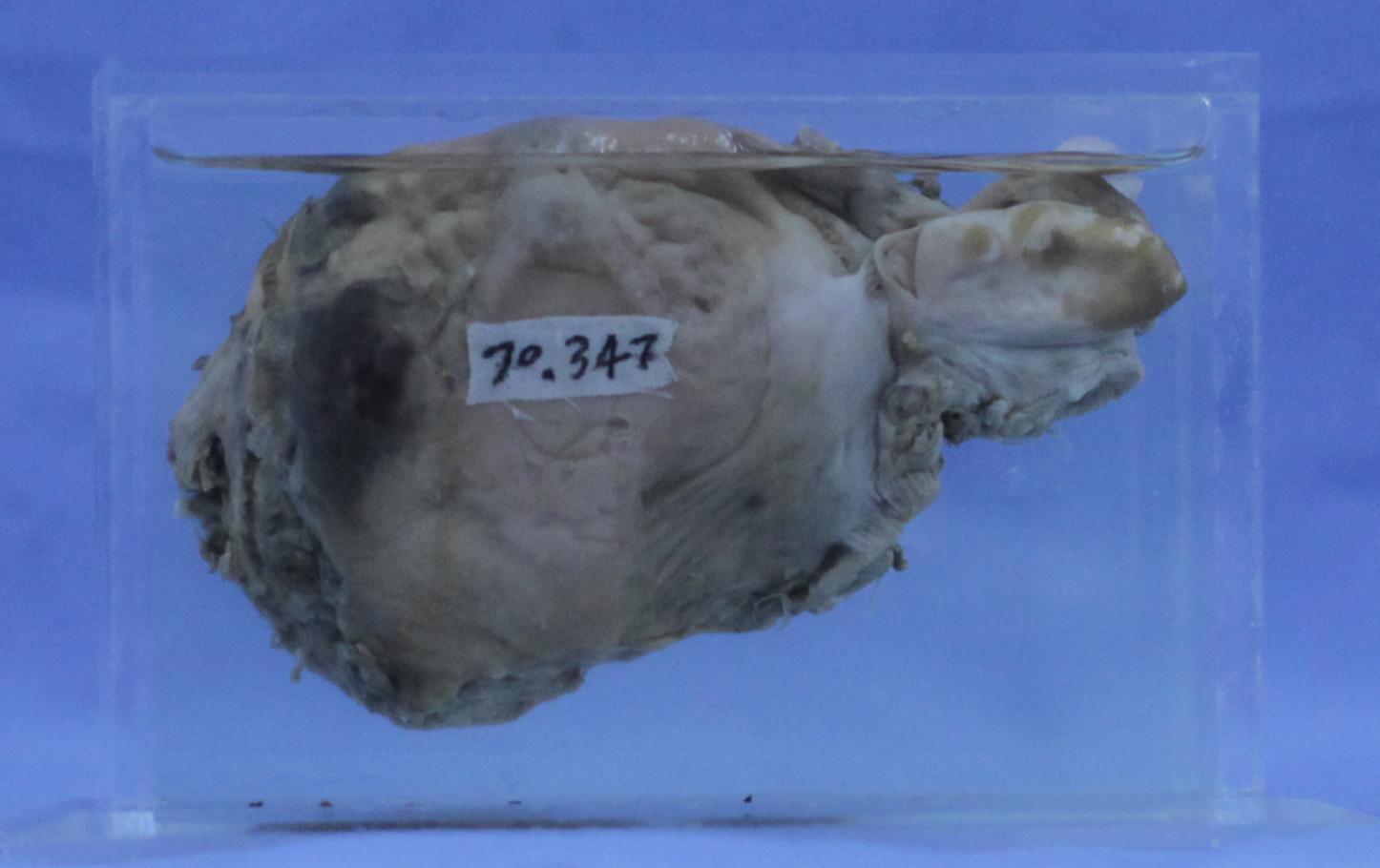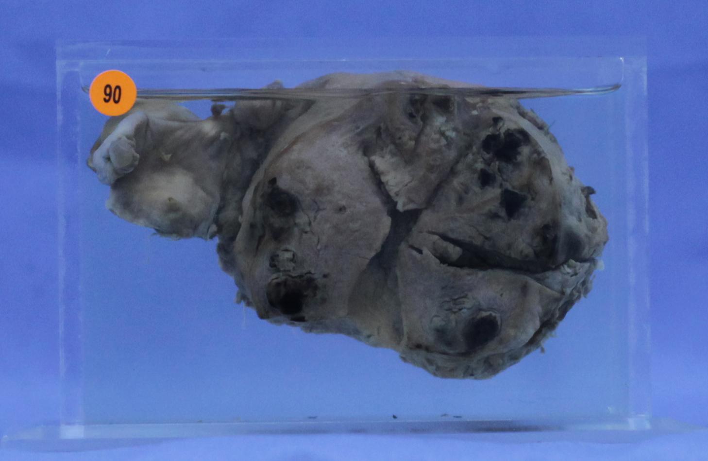 切开子宫,子宫肌壁内见多处出血坏死明显的肿块,颜色为暗红色。浆膜面(标本背面)亦可见暗褐色出血坏死区。