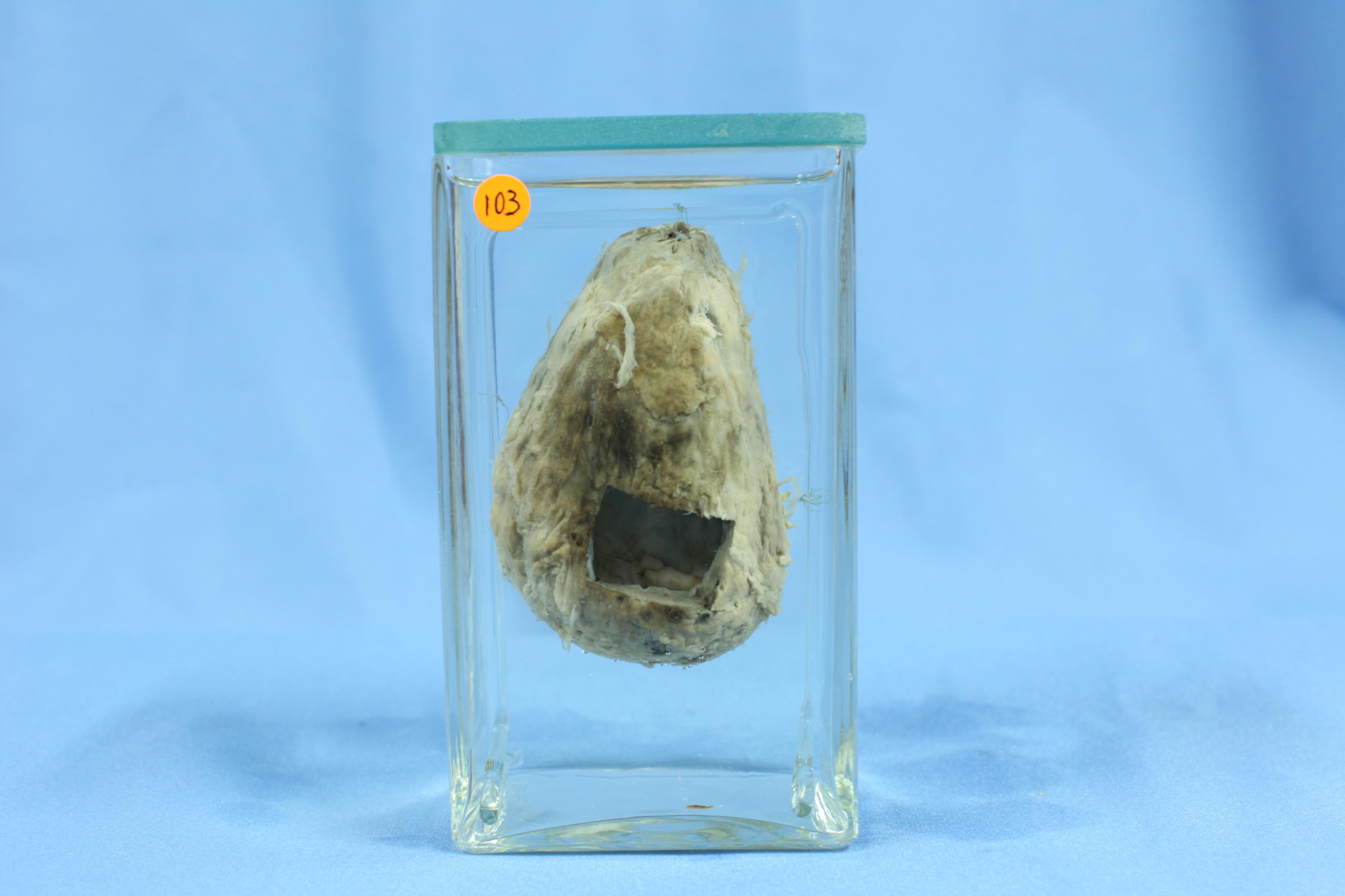 剖开子宫内见羊水已被吸收,胎儿被挤压而干涸,成白色羊皮纸样。