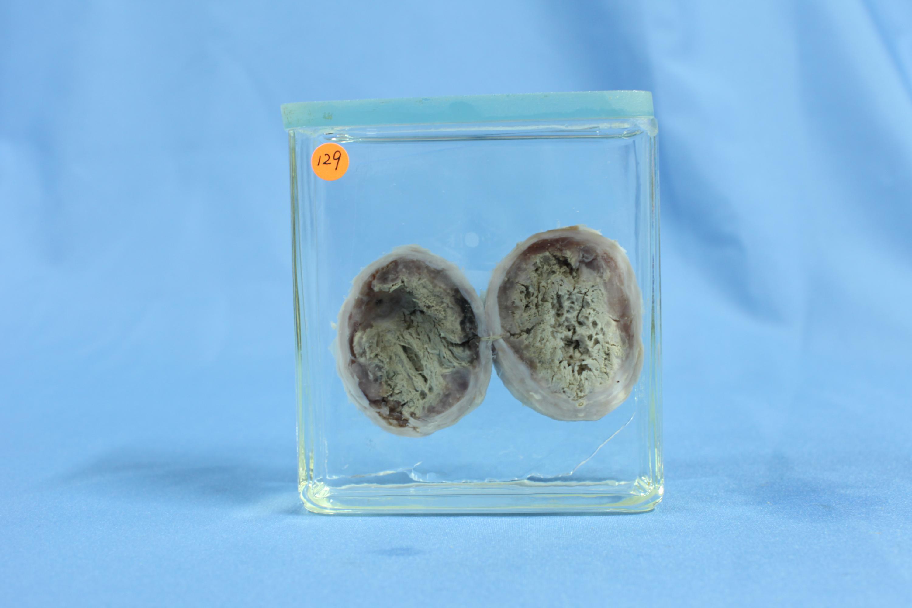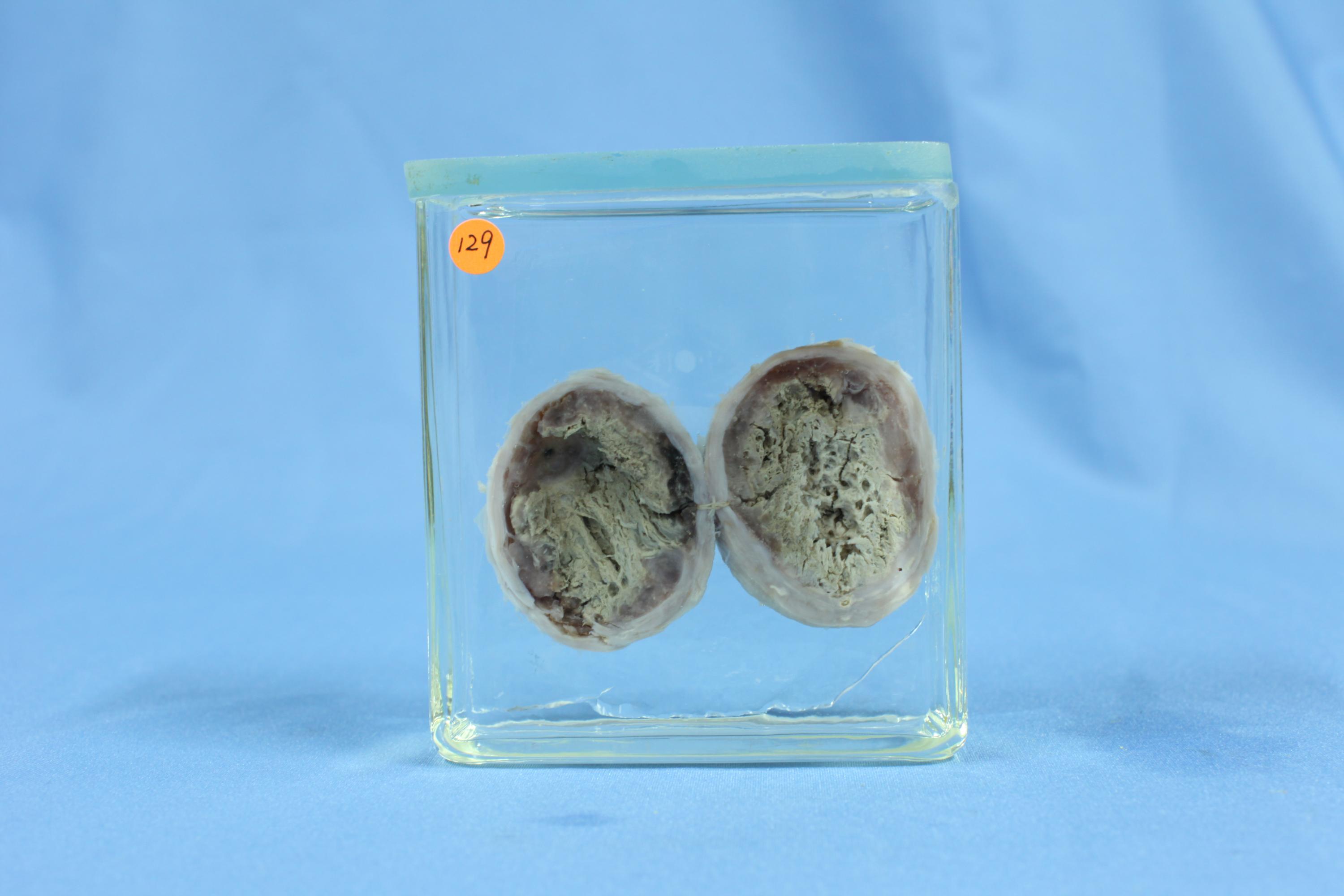 切开睾丸内见腺体组织呈絮状和颗粒状。