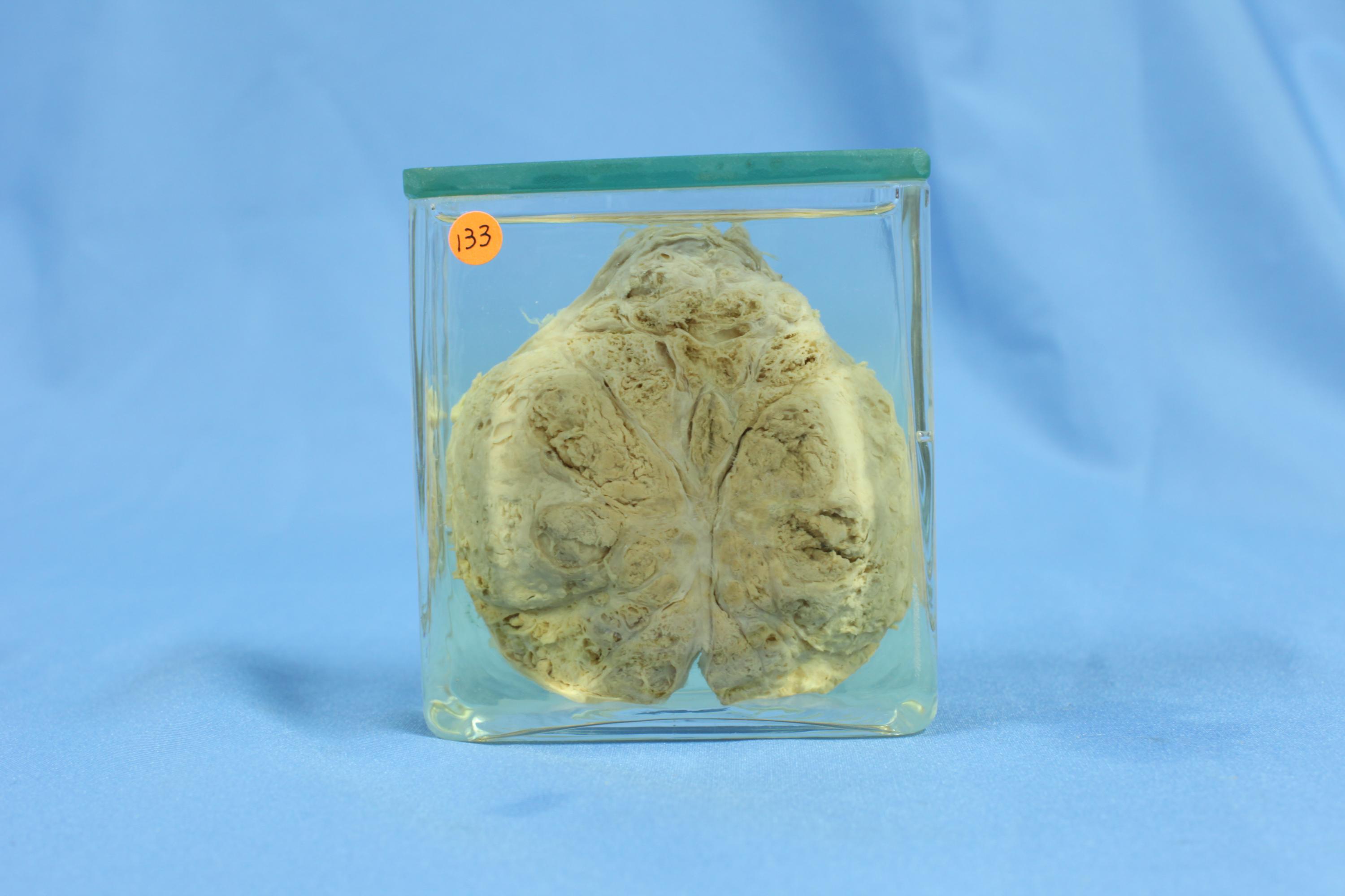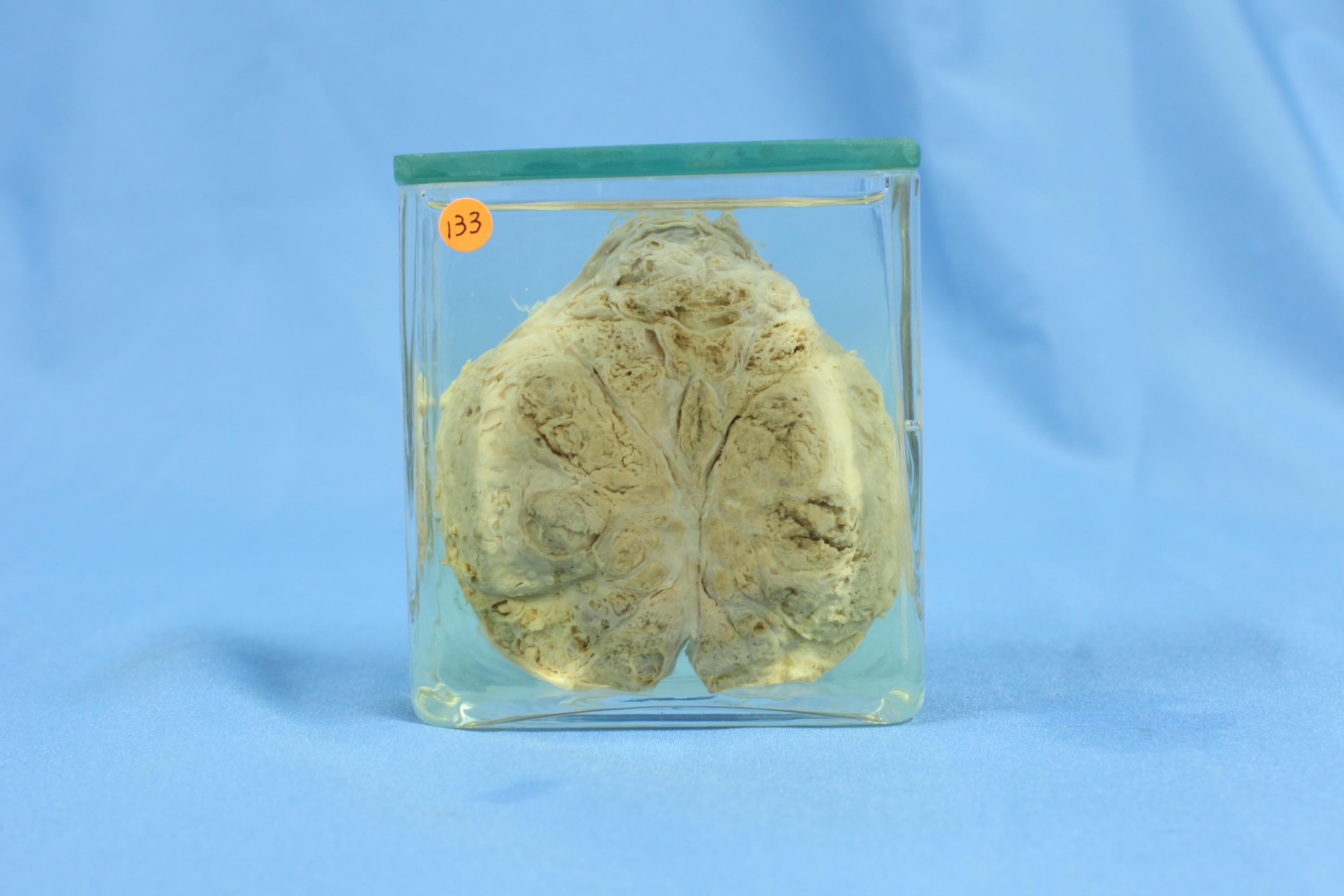 切开睾丸体积增大,大小10X5X4cm。肿瘤切开时有一定阻力,切面充满粘液和透明角质物质的大小不同囊肿,且与大量的实质组织和少量坚实的、半透明的软骨岛和骨刺交替存在。