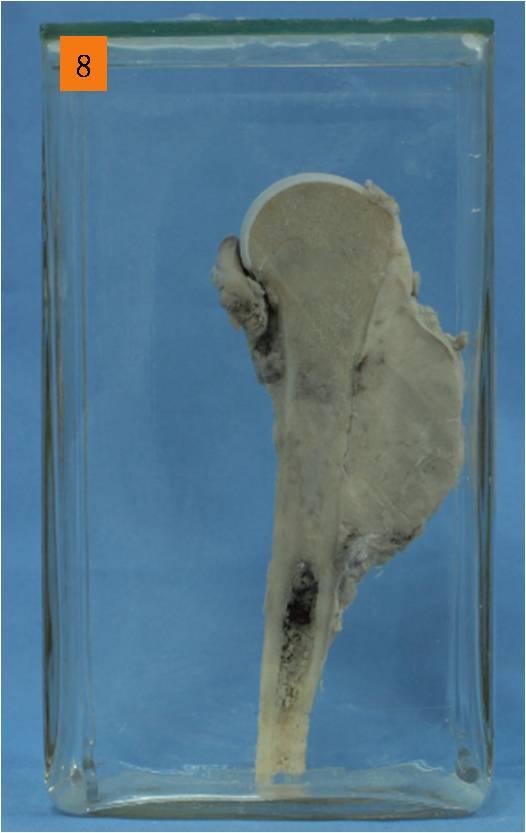 左肱骨上端自干骺端至骨干见一长11.5cm,直径5cm的灰白色肿块,质硬,切面见肿瘤累及骨髓腔,并穿破骨皮质,进入周围软组织,关节面未受累,下端与正常骨交界处可见骨膜被掀起(X线检查表现为Codman三角)。