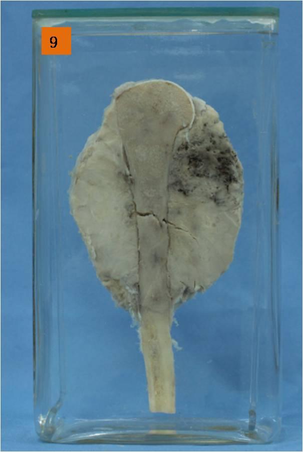 左肱骨上端见一长12cm、直径9cm的膨大,切面见灰白色肿瘤起自干骺端骨组织,有明显的出血、坏死,肿瘤侵犯骨髓腔,并破坏骨皮质,长入周围软组织环形包裹肱骨骨干的巨大肿块。