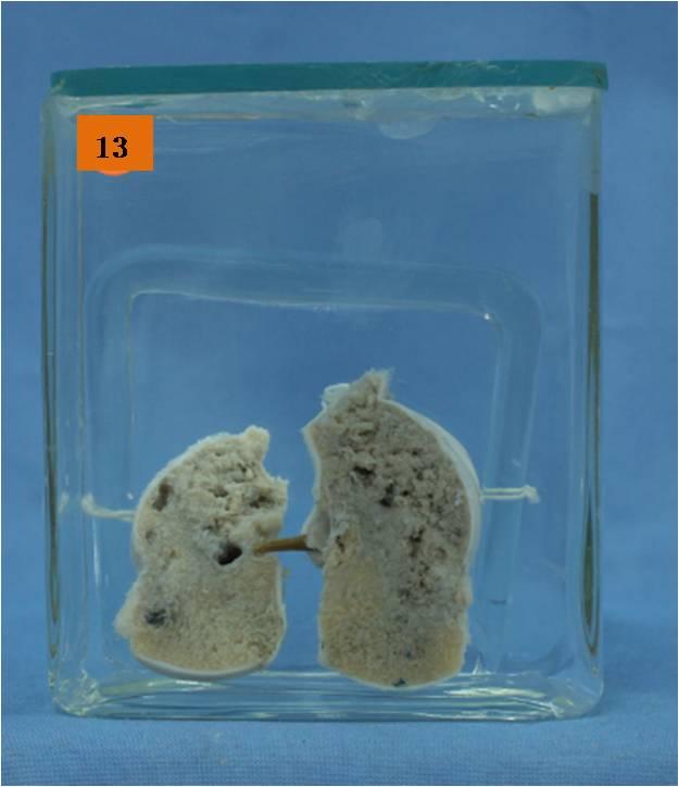 左距骨切面见灰黄灰白色肿瘤组织,有明显的出血、坏死,局部区破坏骨皮质。