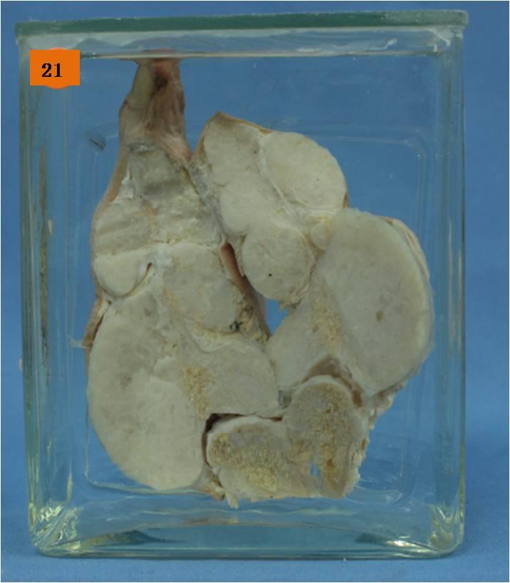 本例肿瘤发生于趾掌关节处,8×4×4cm大小,质硬,切面灰白和乳白色,略有半透明状,界清,无明显出血、坏死。
