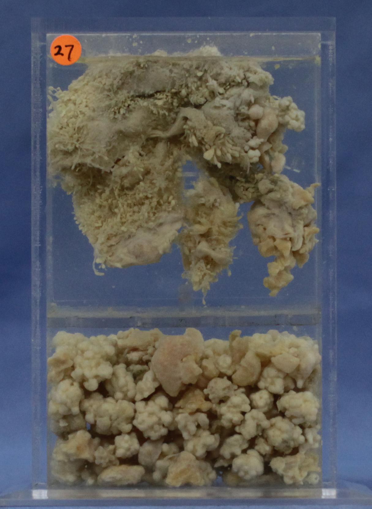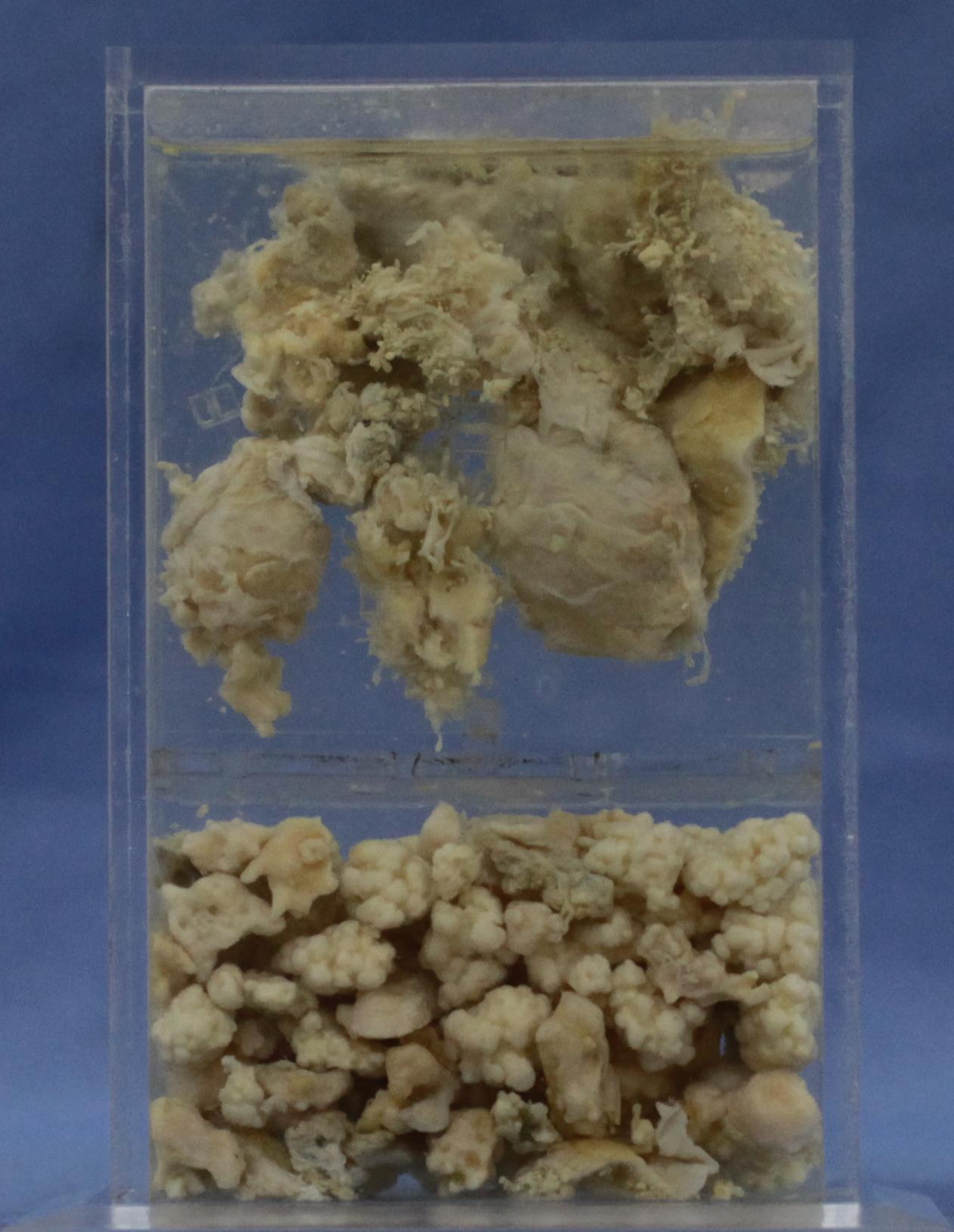 本例标本上部见滑膜组织内面有绒毛状突起,并可见米粒到黄豆大小的乳白色小颗粒,质较硬。标本下部见关节腔内成堆的乳白色颗粒,米粒到蚕豆大小,表面有细颗粒,质硬,半透明。