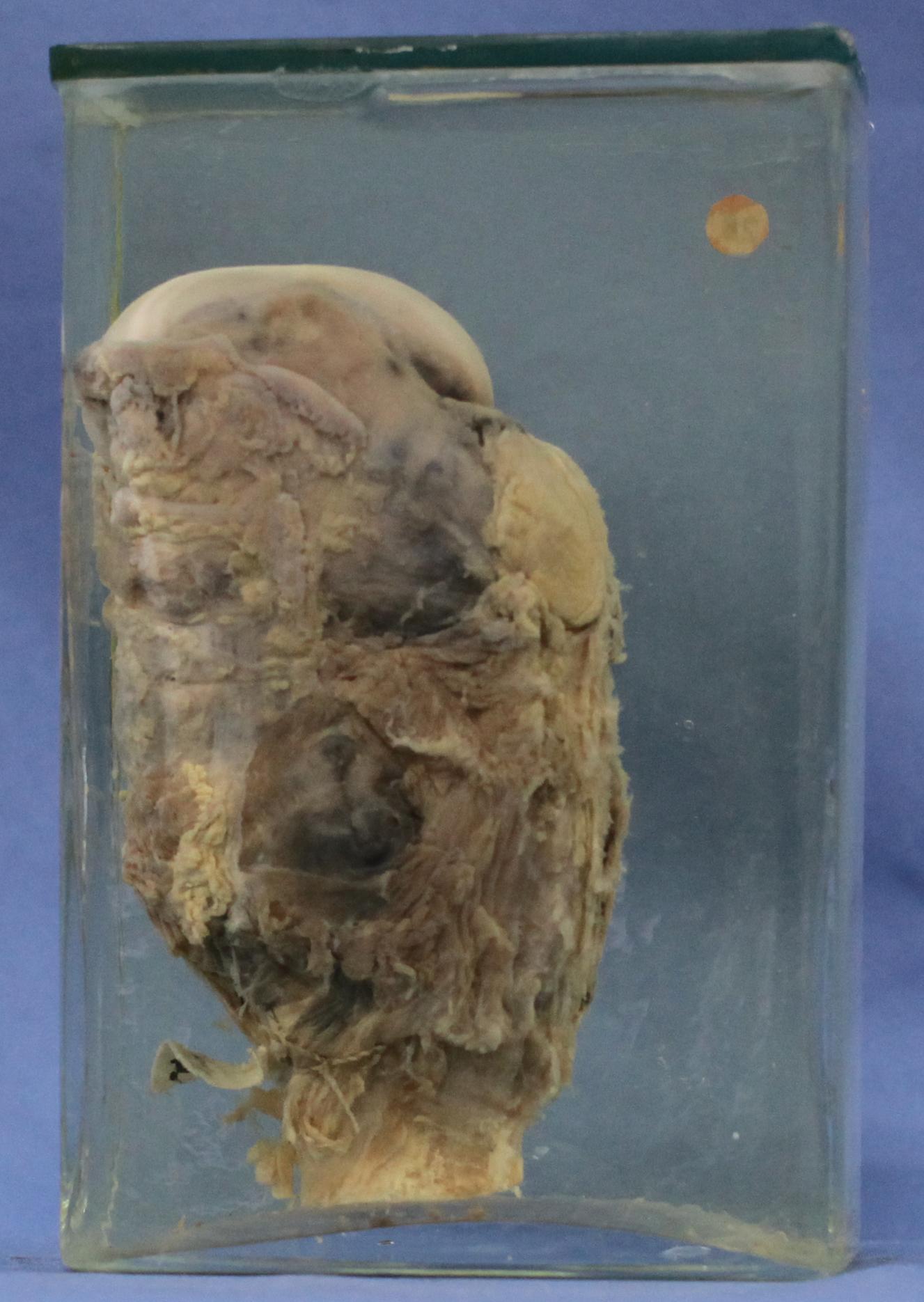 本例标本显示肿瘤位于股骨下端,距关节面6cm处,5×2×2cm大小,乳白色,占据整个骨髓腔,并破坏骨皮质侵入周围软组织,形成长10cm,直径7cm的病灶。切面软组织内肿瘤组织有坏死,不规则脱落,形成破絮状外观。