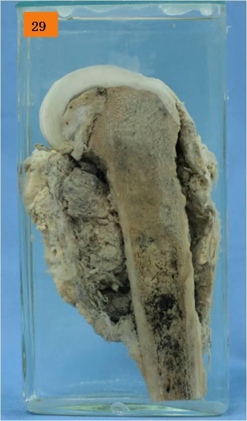 左股骨下端干骺端膨大,切面见大片灰红灰白色肿瘤组织,破坏骨质,并侵入周围软组织,形成长11cm,直径6cm的包块,有明显的出血、坏死、囊性变。