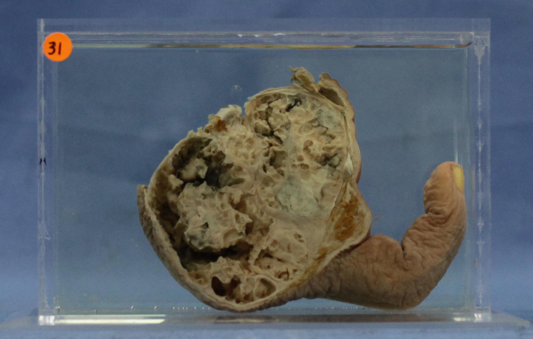 本例标本显示左手第2掌骨局部膨大,7.5×6×4cm,切面见分叶状、乳白色、半透明状,并见大片出血、坏死、囊性变,肿瘤肉眼境界清,无包膜。