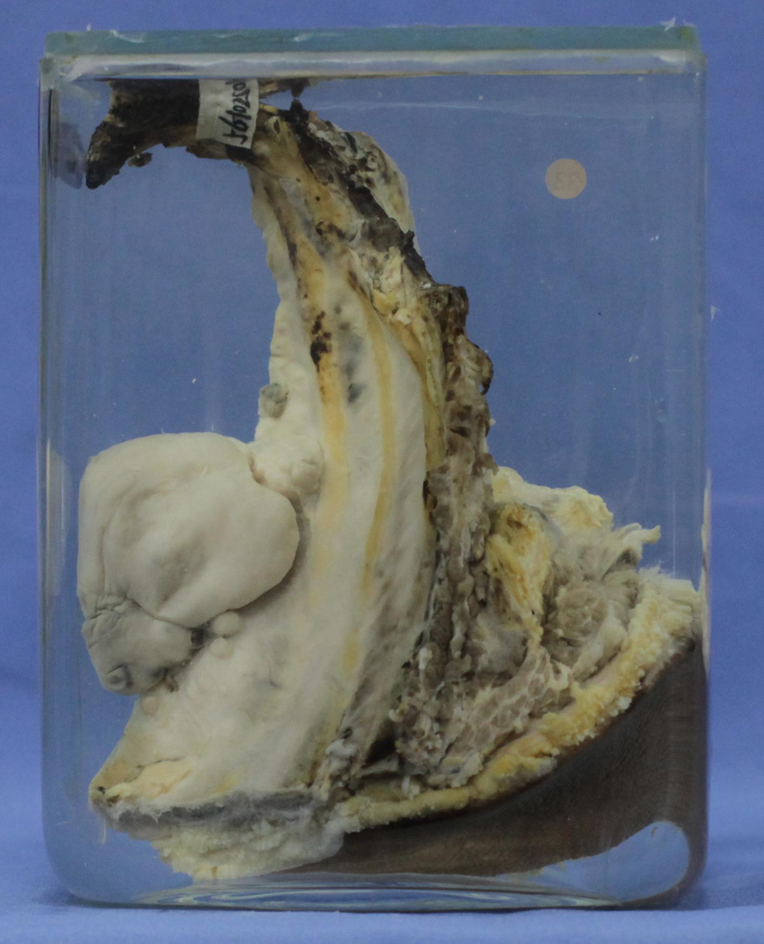肋骨一段长11cm,直径4cm,切面乳白色,略带半透明状,其一侧局部膨大形成13×10×7cm的肿块,肉眼境界清,质硬,散在有出血、坏死。