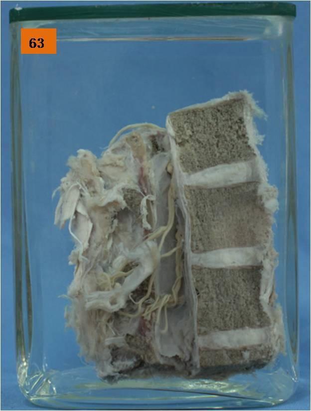 腰椎切面见多个椎体骨质破坏,为灰白色肿瘤所占据,肿瘤已破坏骨皮质,相邻椎体病变融合,并侵入周围软组织。