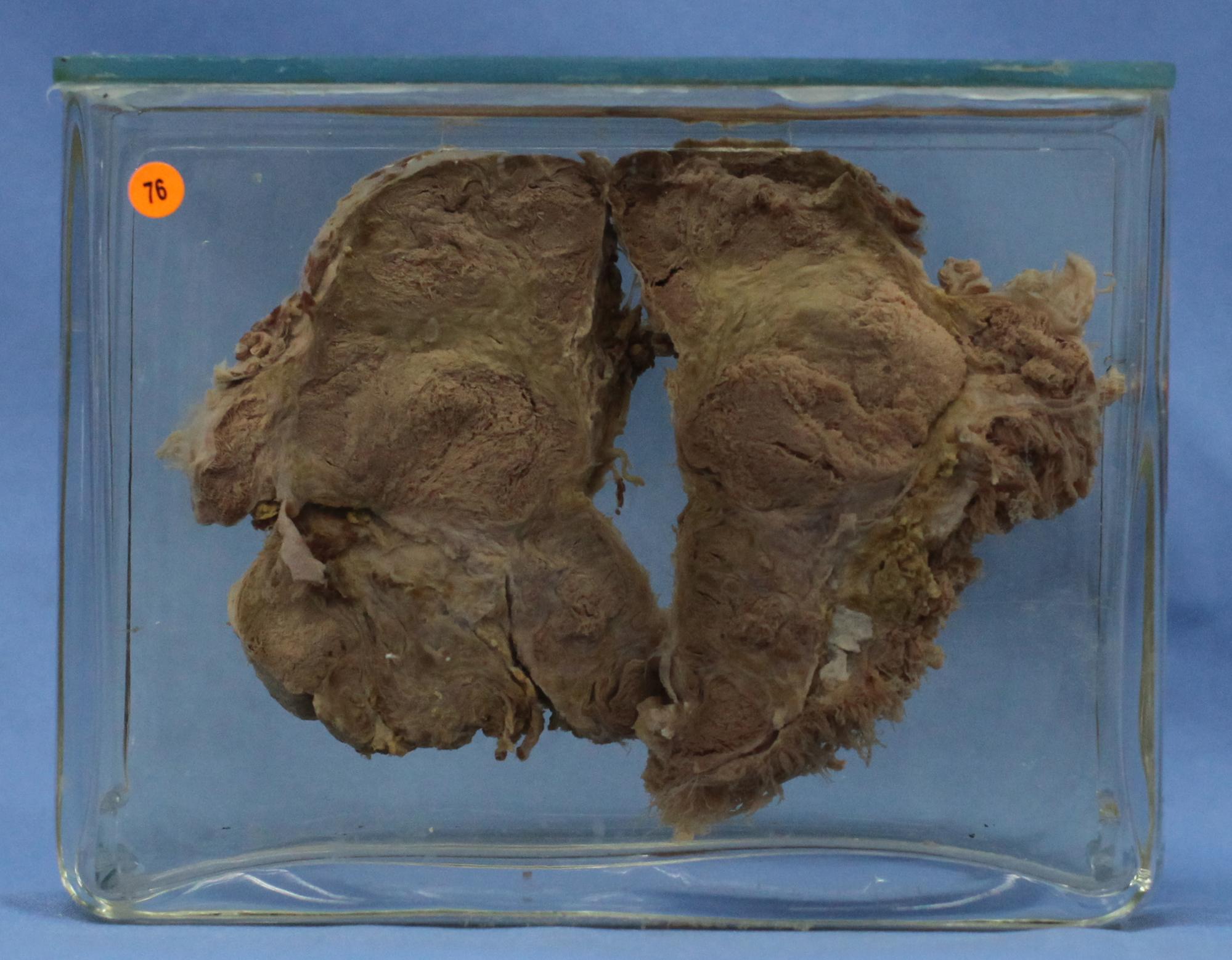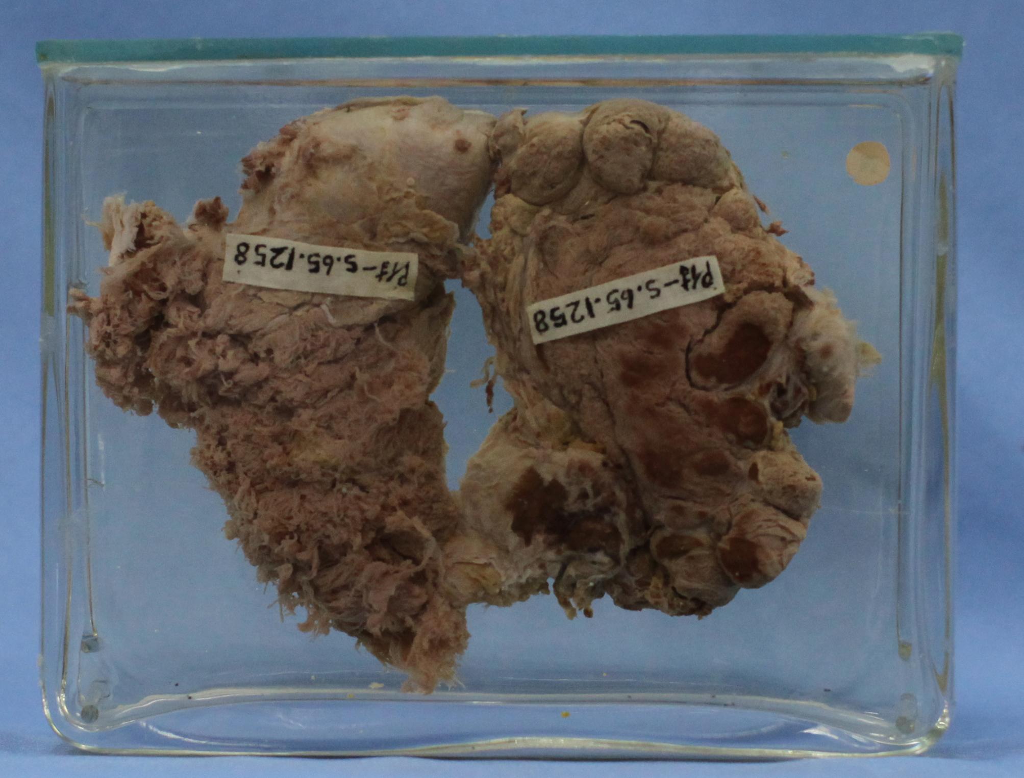 灰黄色肿块11×6.5×3cm,表面和切面均呈结节状,表面有绒布状细小突起。