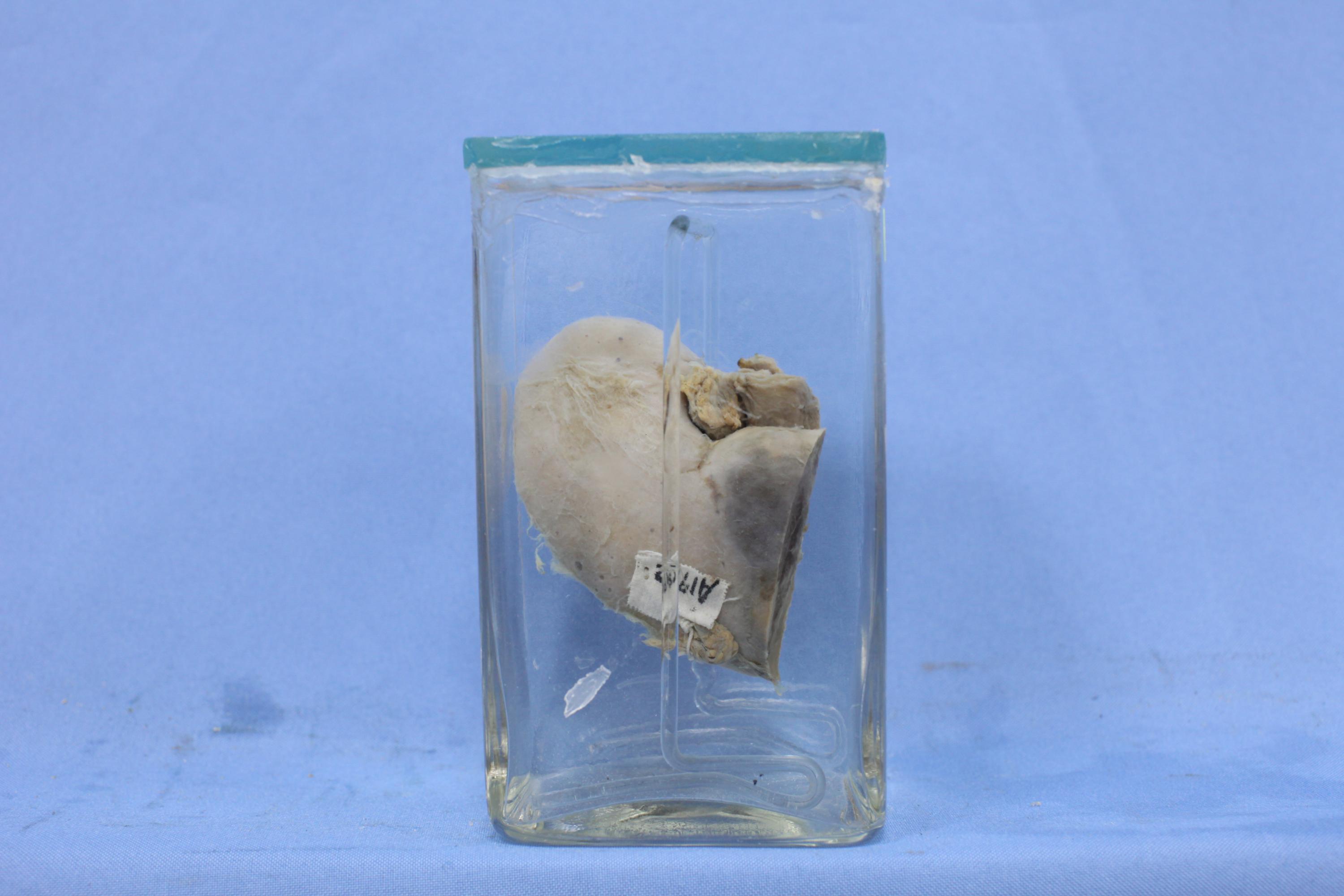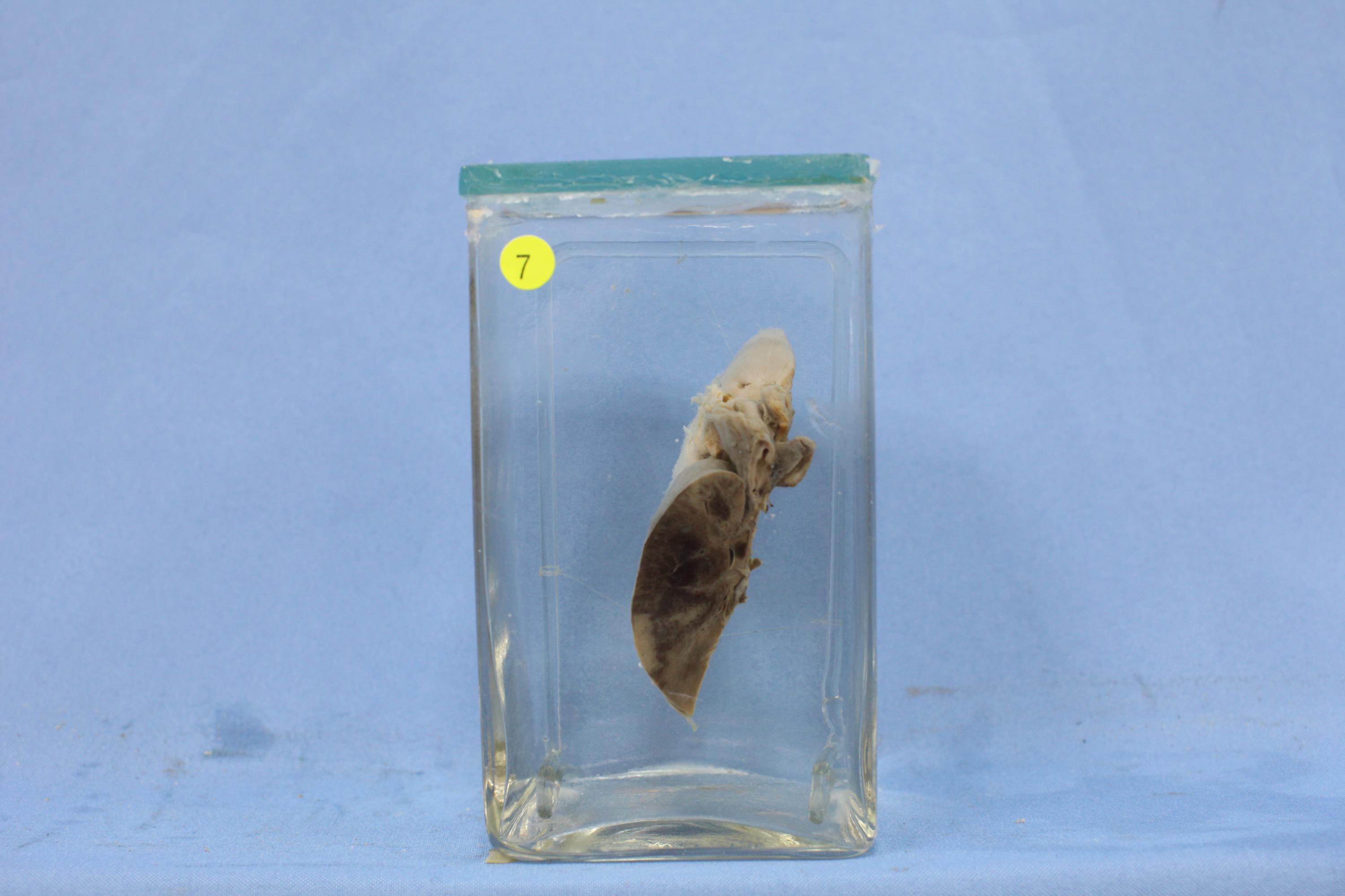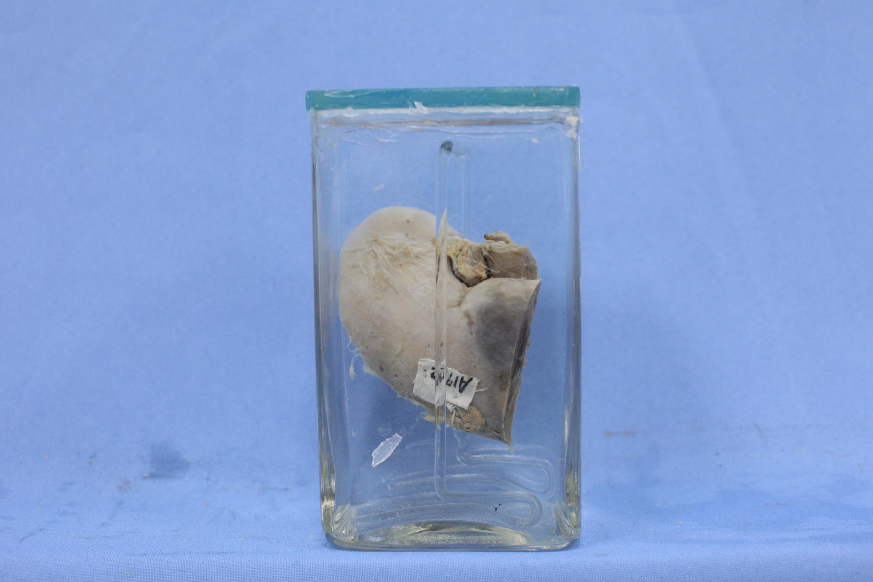 部分肾脏标本。肾脏断面见一灰白色略呈楔形的梗死灶,周围有明显充血、出血,楔形尖端指向肾门,梗死灶底部紧贴肾包膜。肾脏表面呈现灰白色梗死区及充血出血区。肾脏切面皮髓质分界清晰。