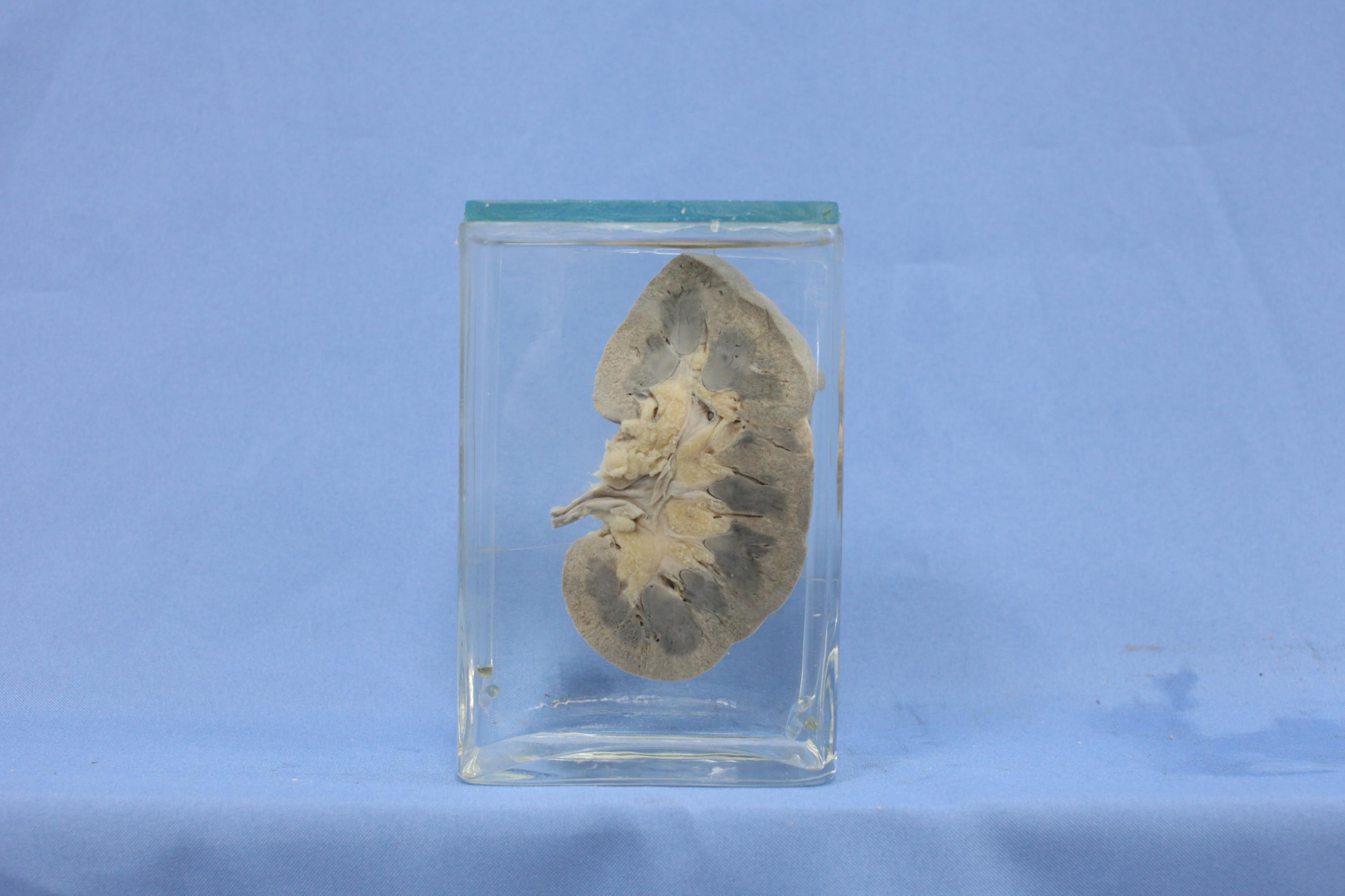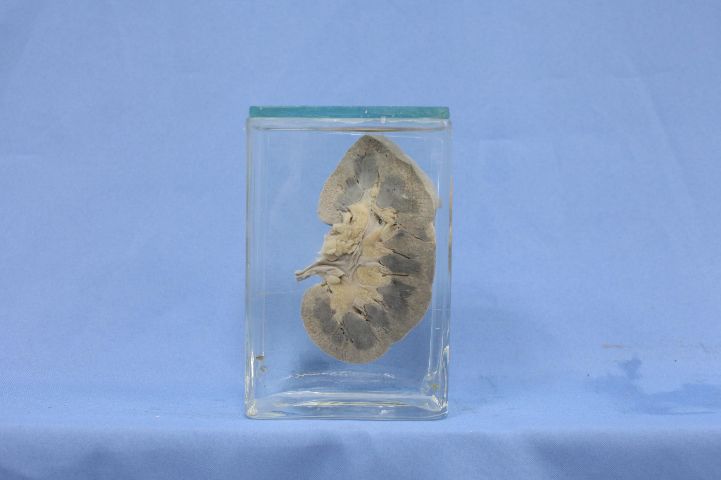 肾脏表面粗糙,细颗粒样外观,见多发性凹陷区,灰白色、质硬。肾脏切面见一灰色梗死灶皮髓质分界清楚,髓质淤血。