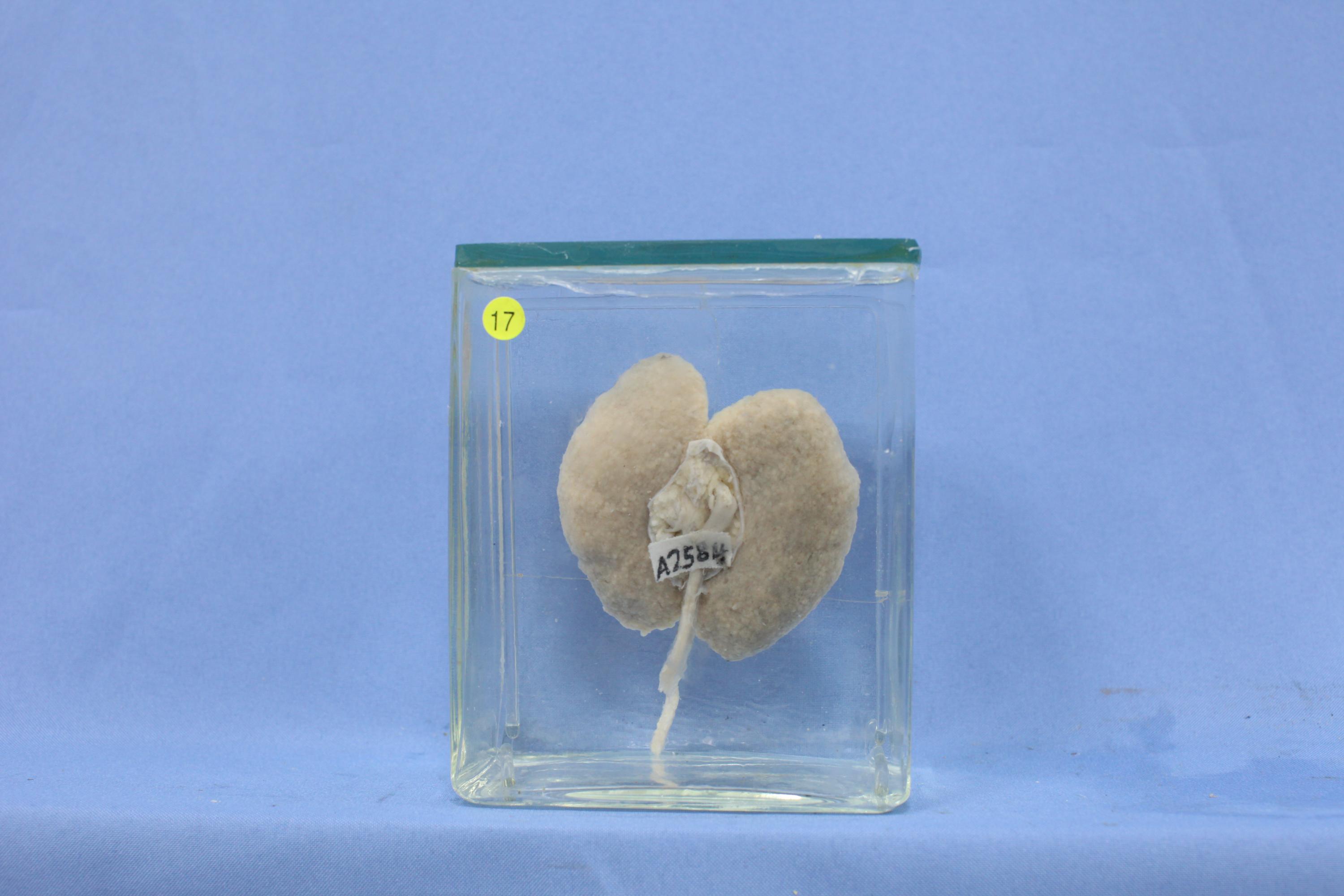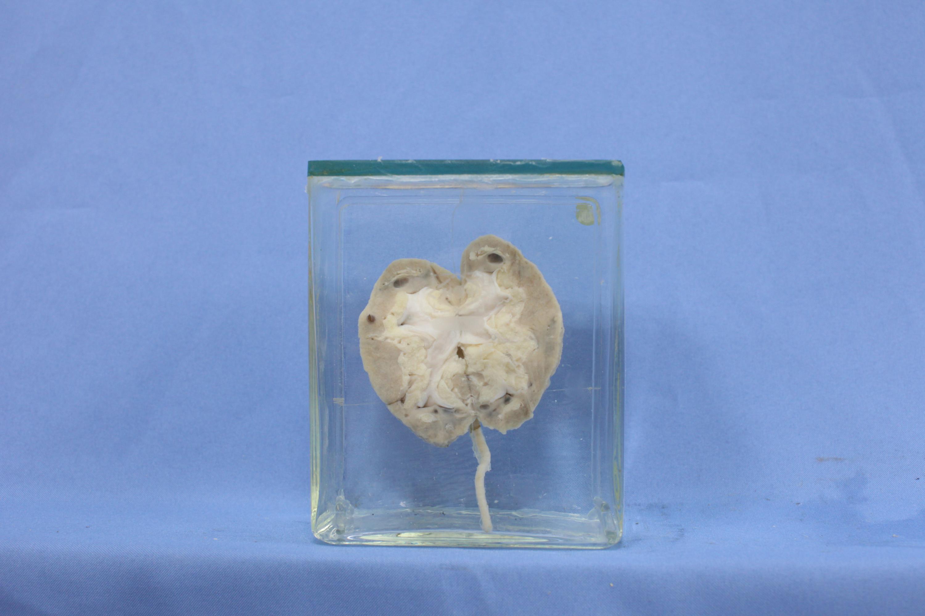 肾脏体积明显缩小,表面粗糙,均匀密布直径1-2mm细颗粒。切面见皮髓境界消失,见多发性囊肿形成。肾动脉细窄质硬。肾盂黏膜粗糙。 **