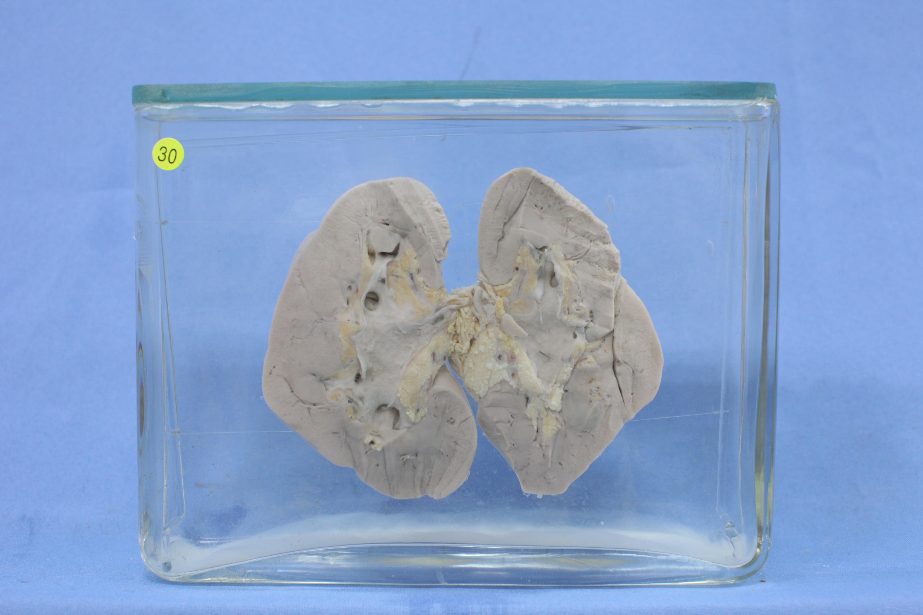 肾脏体积缩小,表面见瘢痕,呈凹陷状,致肾外形不规则。切面皮质变薄,皮髓分界不清,肾盂扩张,黏膜粗糙,破絮状。