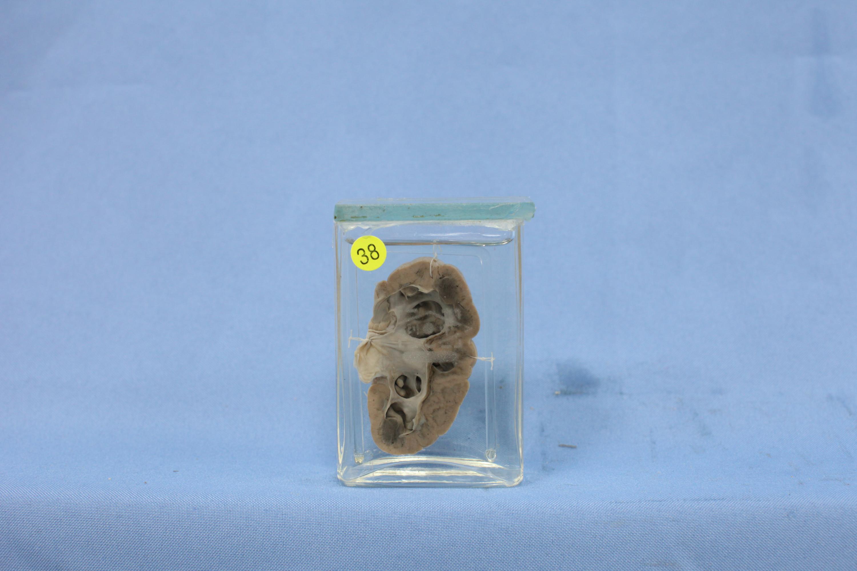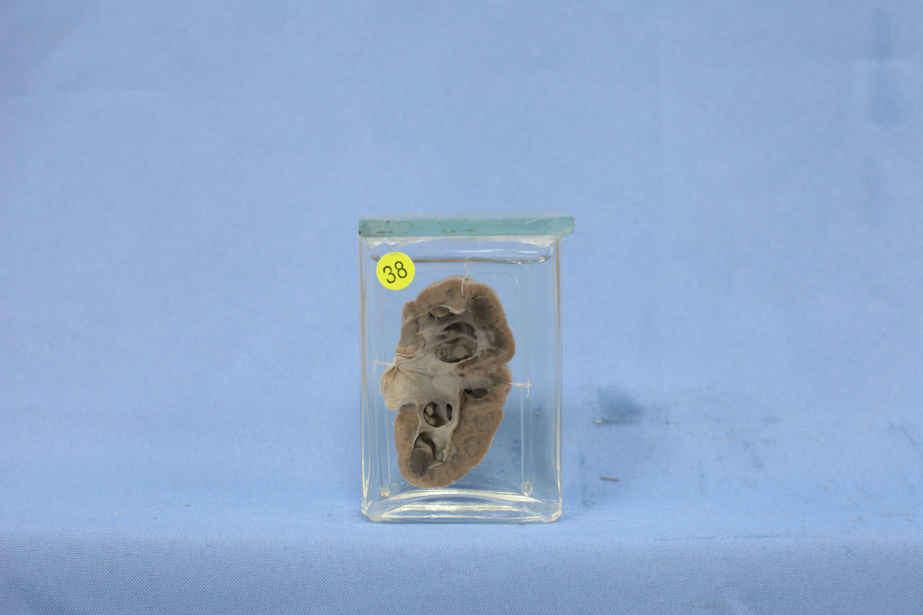 肾脏表面呈桑椹形,肾盂肾盏扩张,肾实质萎缩,皮髓分界尚清,皮质变薄。