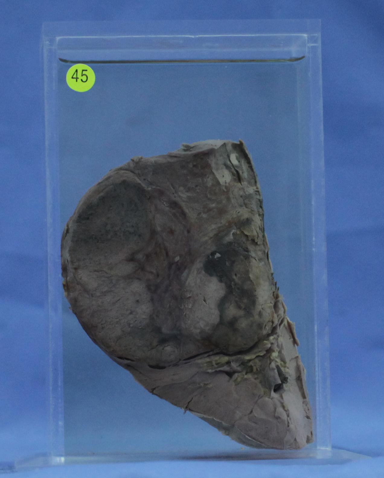肾脏体积增大,见一巨大圆形占位性病变,直径约10cm,切面灰红、灰白、灰黑相间,部分区域出血坏死,局部粘液样变。肾实质受压萎缩,肿瘤与正常组织境界清晰。