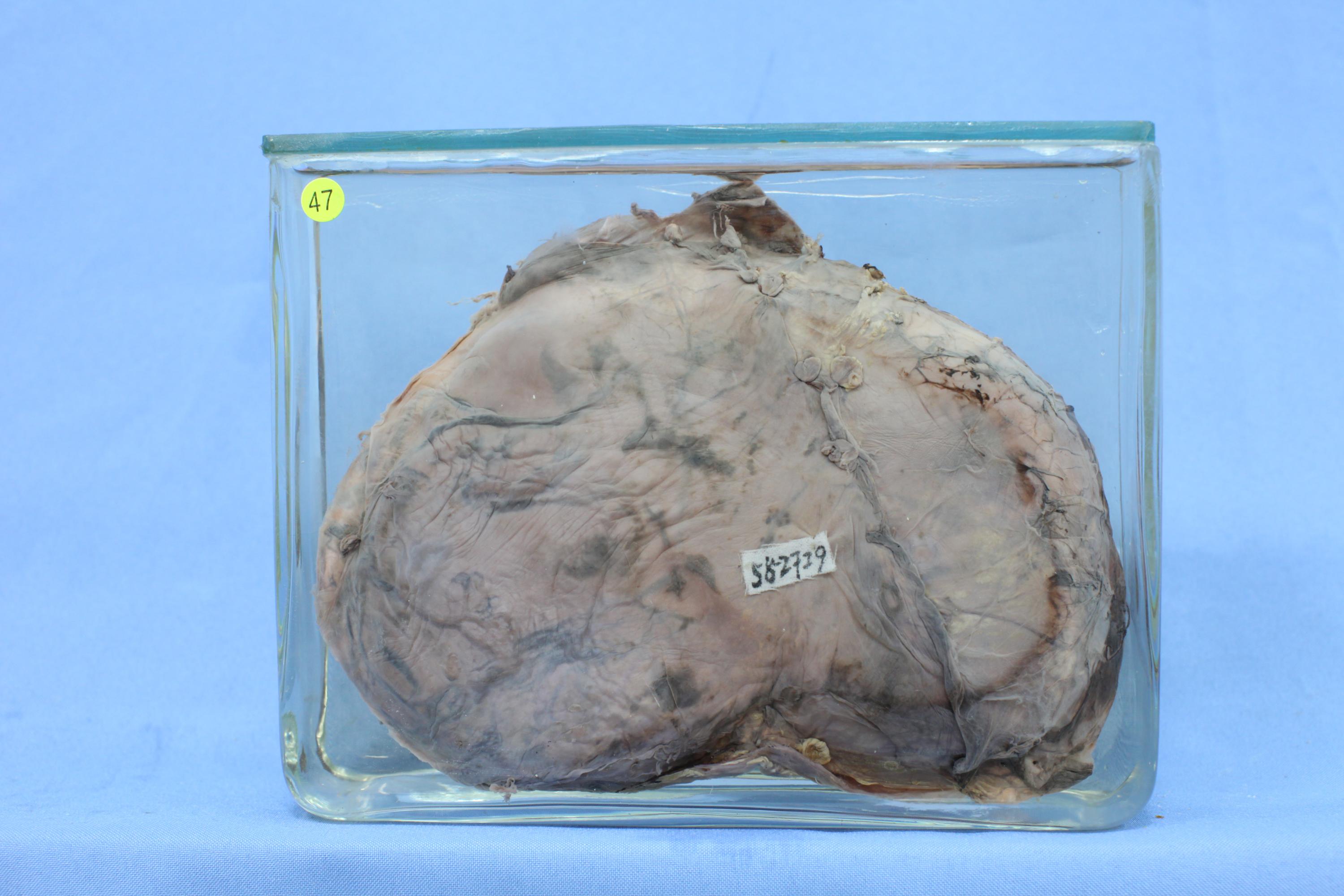 肾脏为巨大肿块所占据,切面皮质、髓质不可见,肿瘤切面灰红色质中,间或有纤维组织包绕。内见少量漩涡状纤维结缔组织。