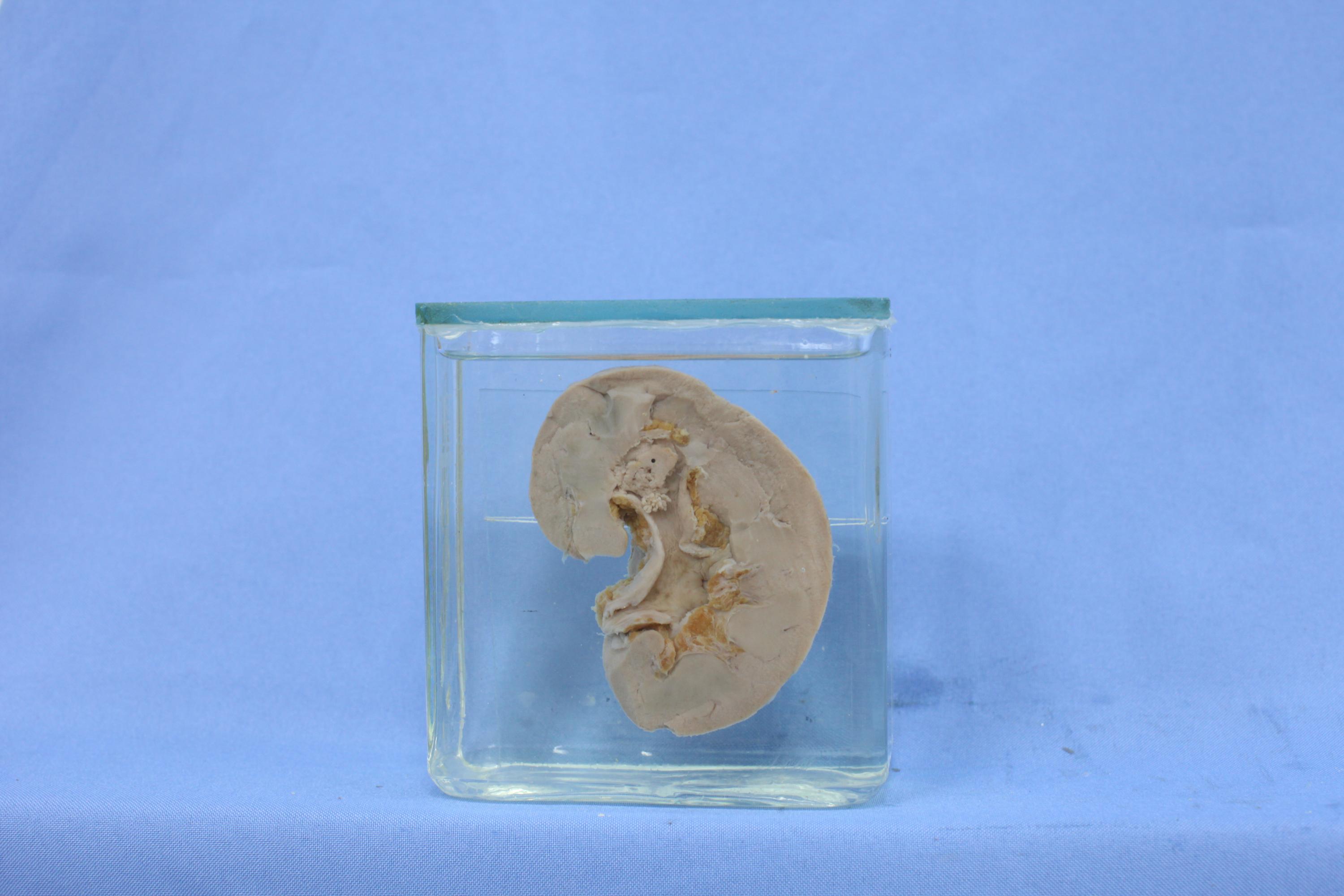 肾脏体积缩小,肾盂黏膜见微小乳头状生长赘生物,肾脏上极瘢痕形成,致肾脏外观形成多处不规则凹陷。