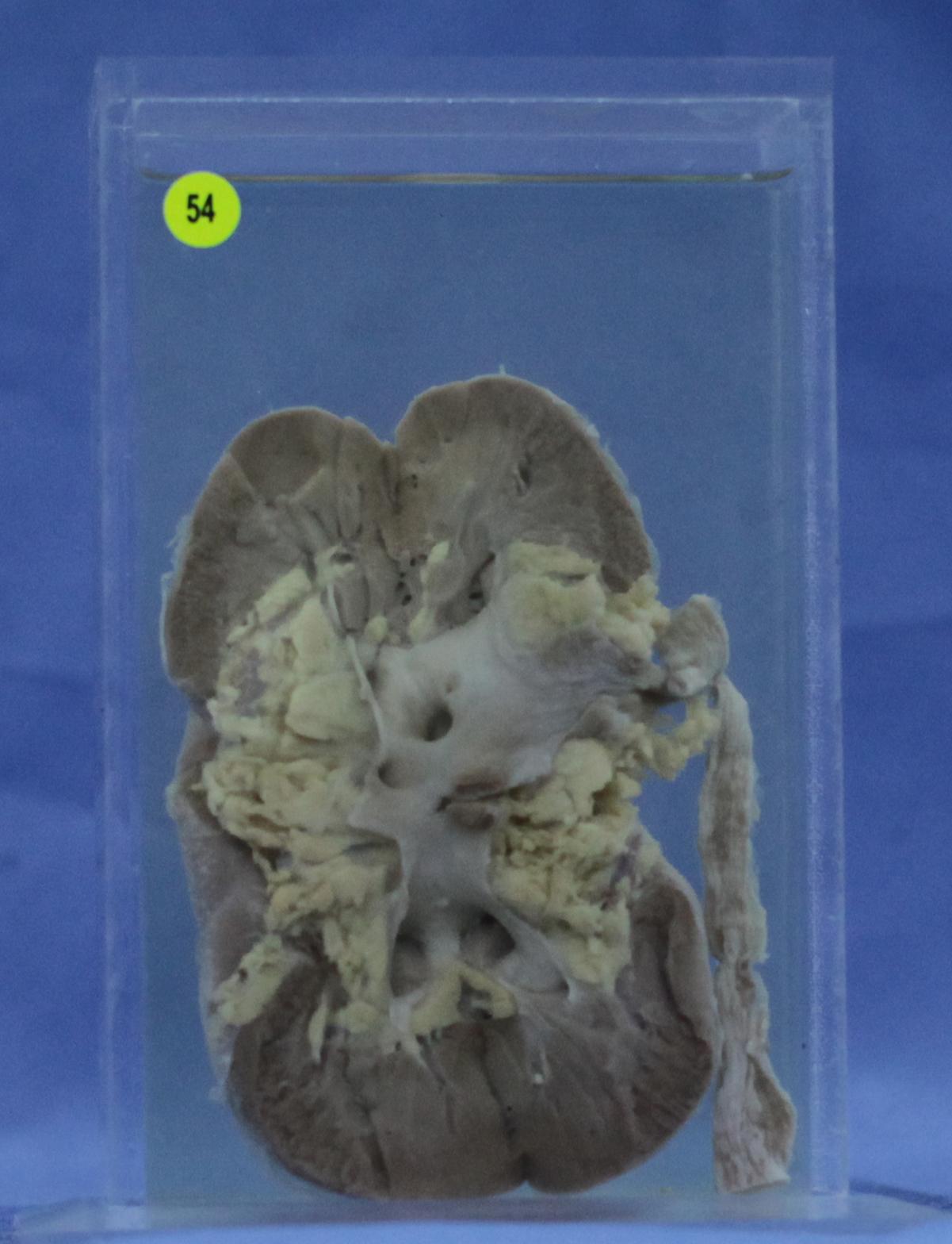 肾脏体积缩小,切面见肾盂黏膜处有一灰红色质嫩赘生物。