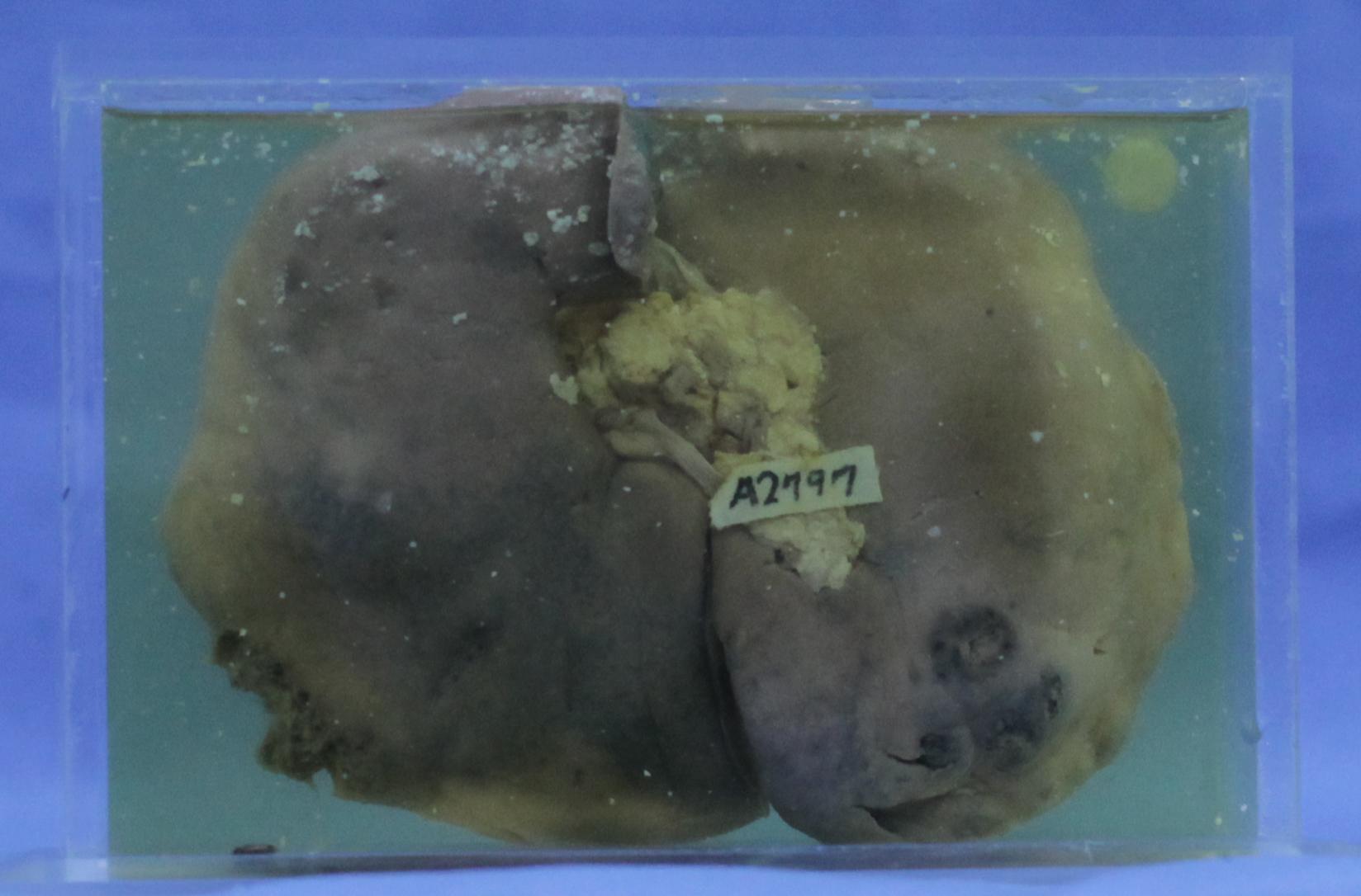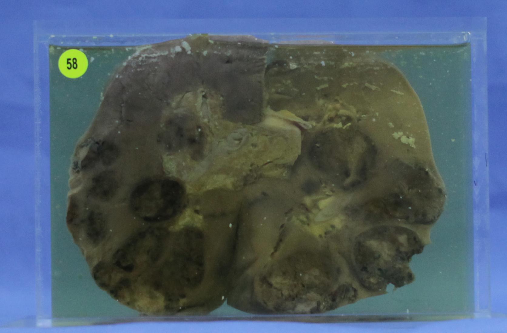 肾脏体积增大,切面见数枚大小不一圆形、类圆形占位性病变,质松脆,肿瘤出血明显,与周围正常组织分界较清,其余肾组织结构模糊,皮髓分界不清。肾脏表面可见包膜下类似圆形占位性病变,个别破溃出血。肾脏淤血明显。