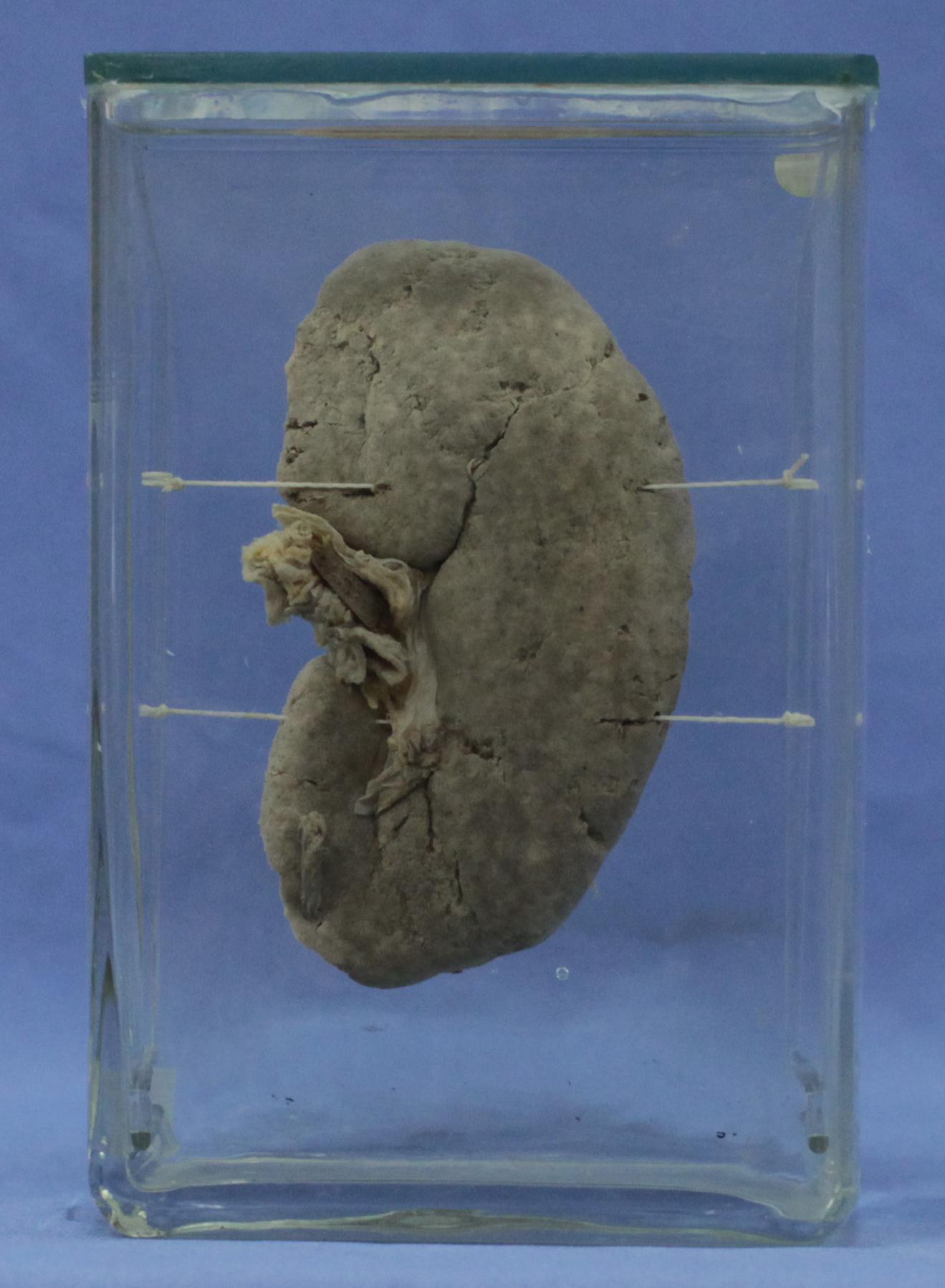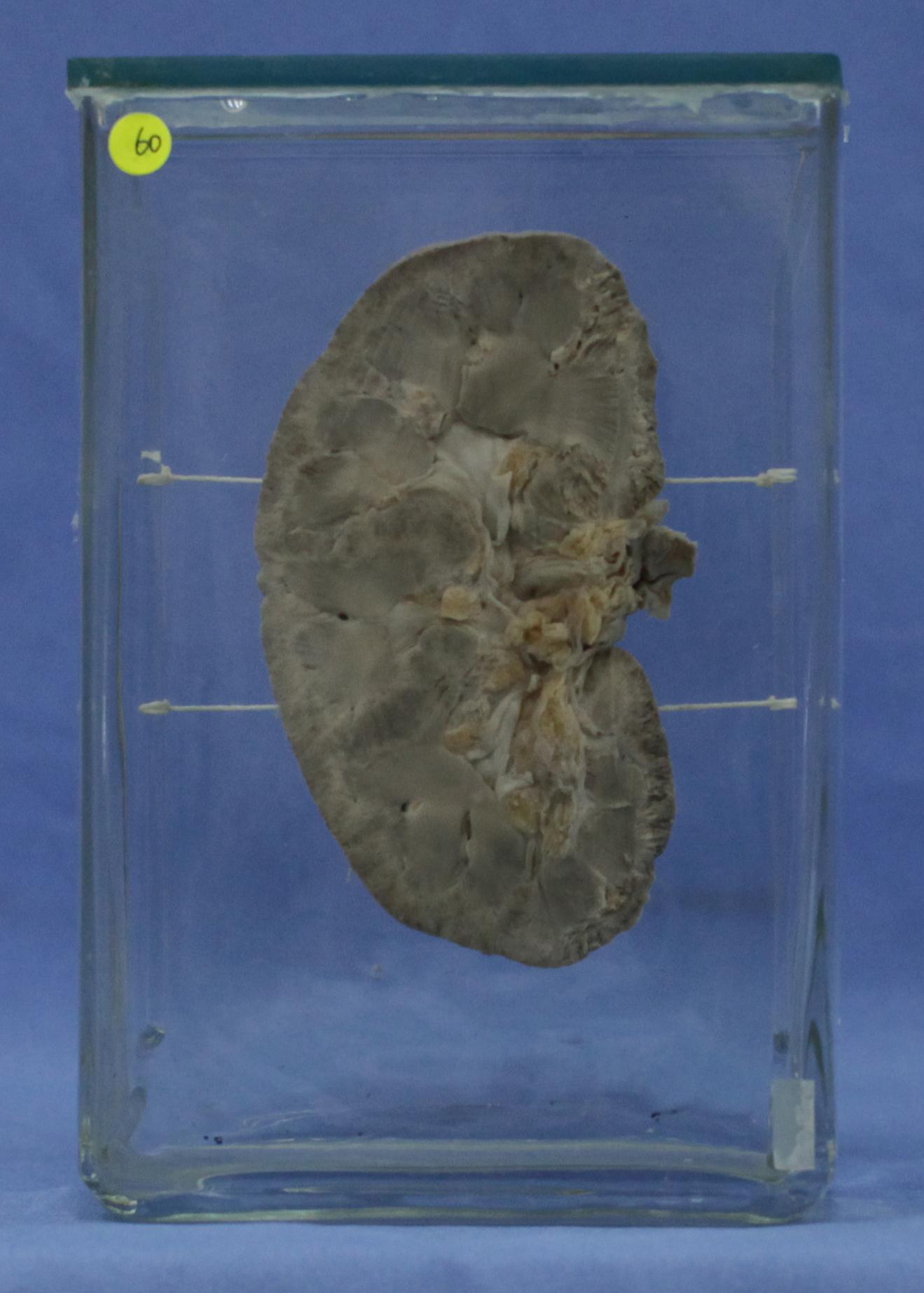 肾脏灰红色,质地松烂,肾脏切面见皮质区较多量灰红色针尖大小灰红色色素沉着,皮质变薄,皮髓分界清。肾脏表面可见相应色素沉着病变。