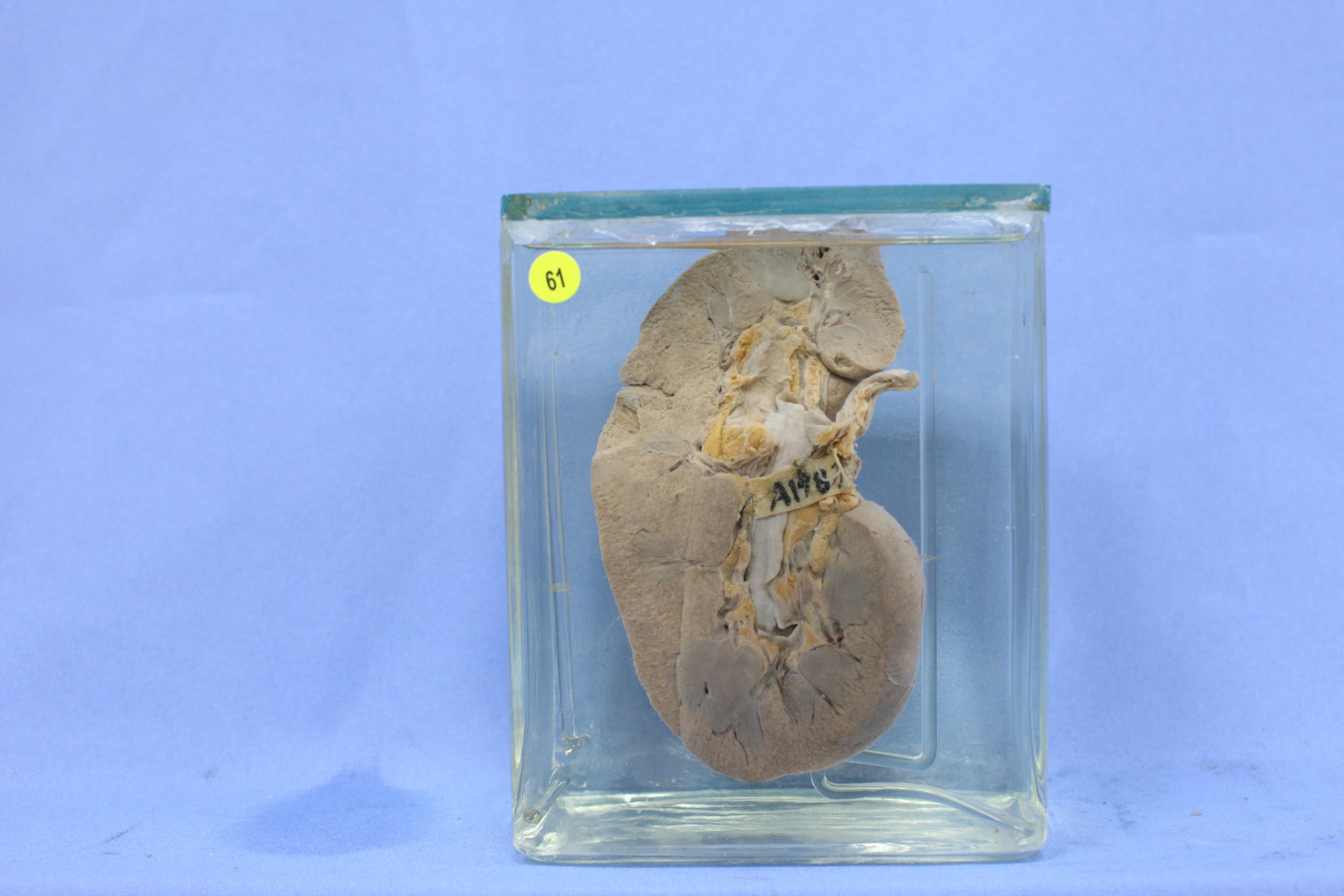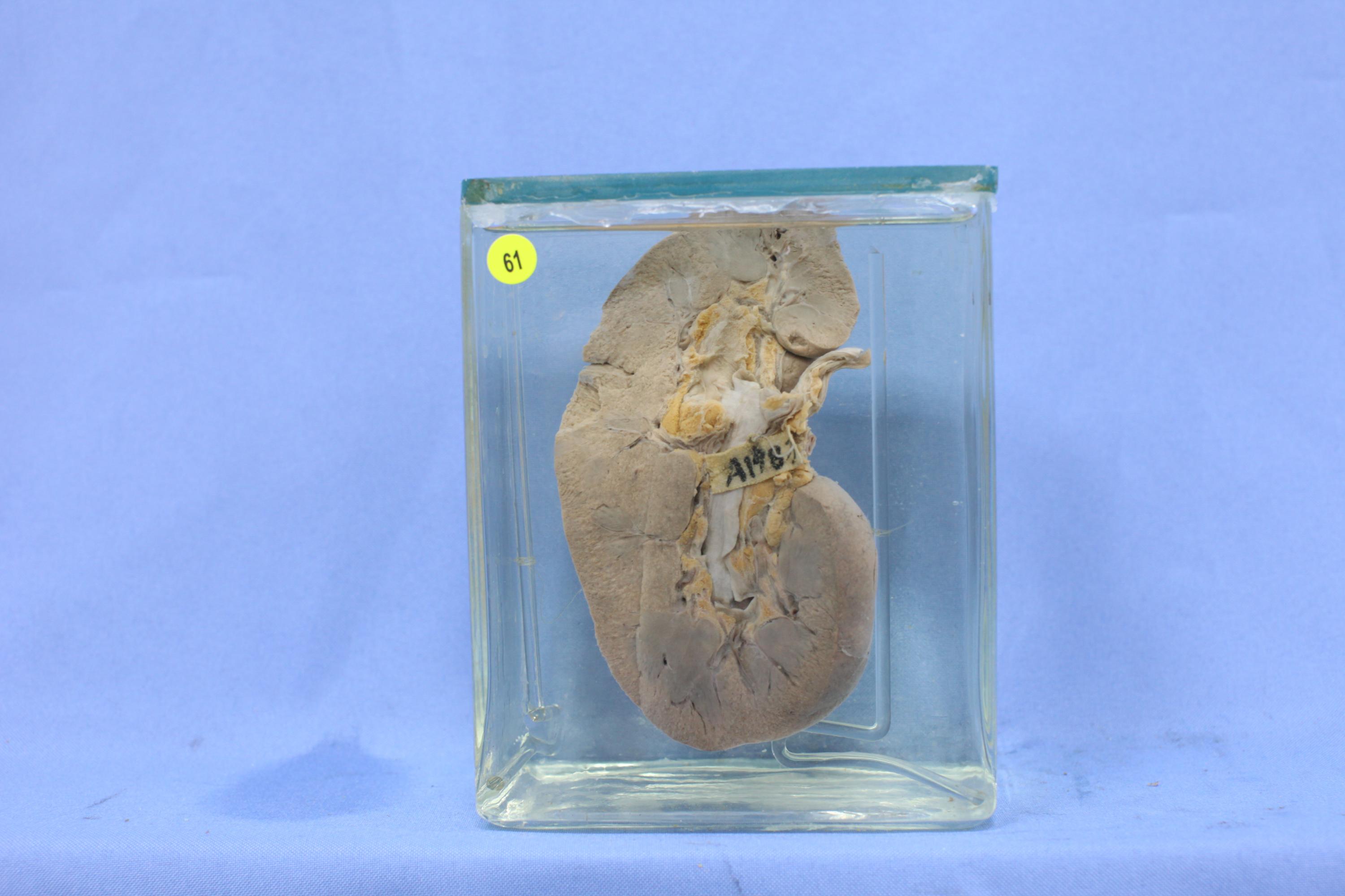 肾脏,呈暗黄色,切面皮质见较多黄白色条纹状结构,皮髓分界清晰。肾脏表面见较多粟粒大小黄白色点状结构,局部有充血、淤血。