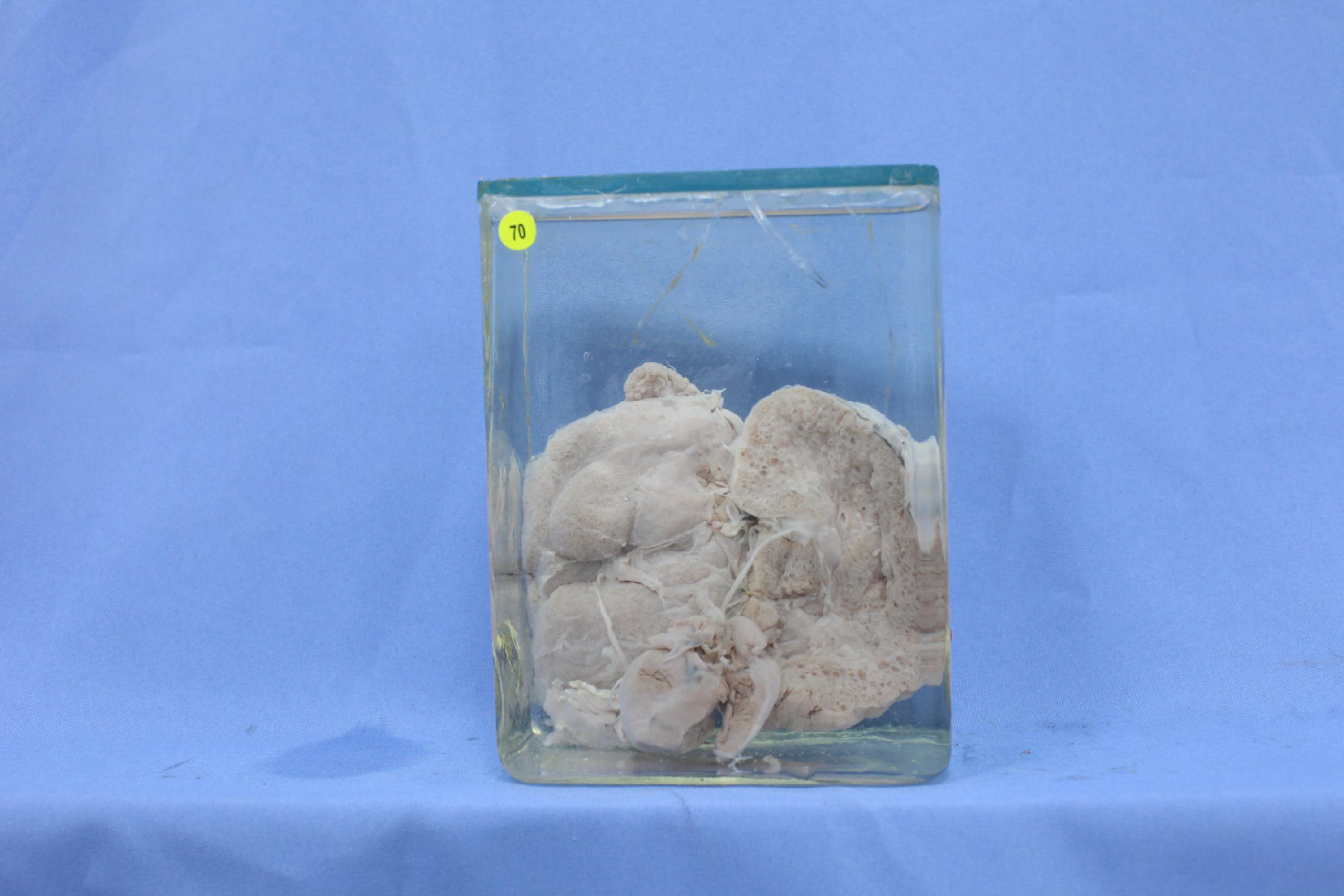 肾脏质软,切面皮质髓质不可见,实质部分见广泛分布微小圆形腔隙,形成多孔状外观,肾脏表面亦见相应改变。