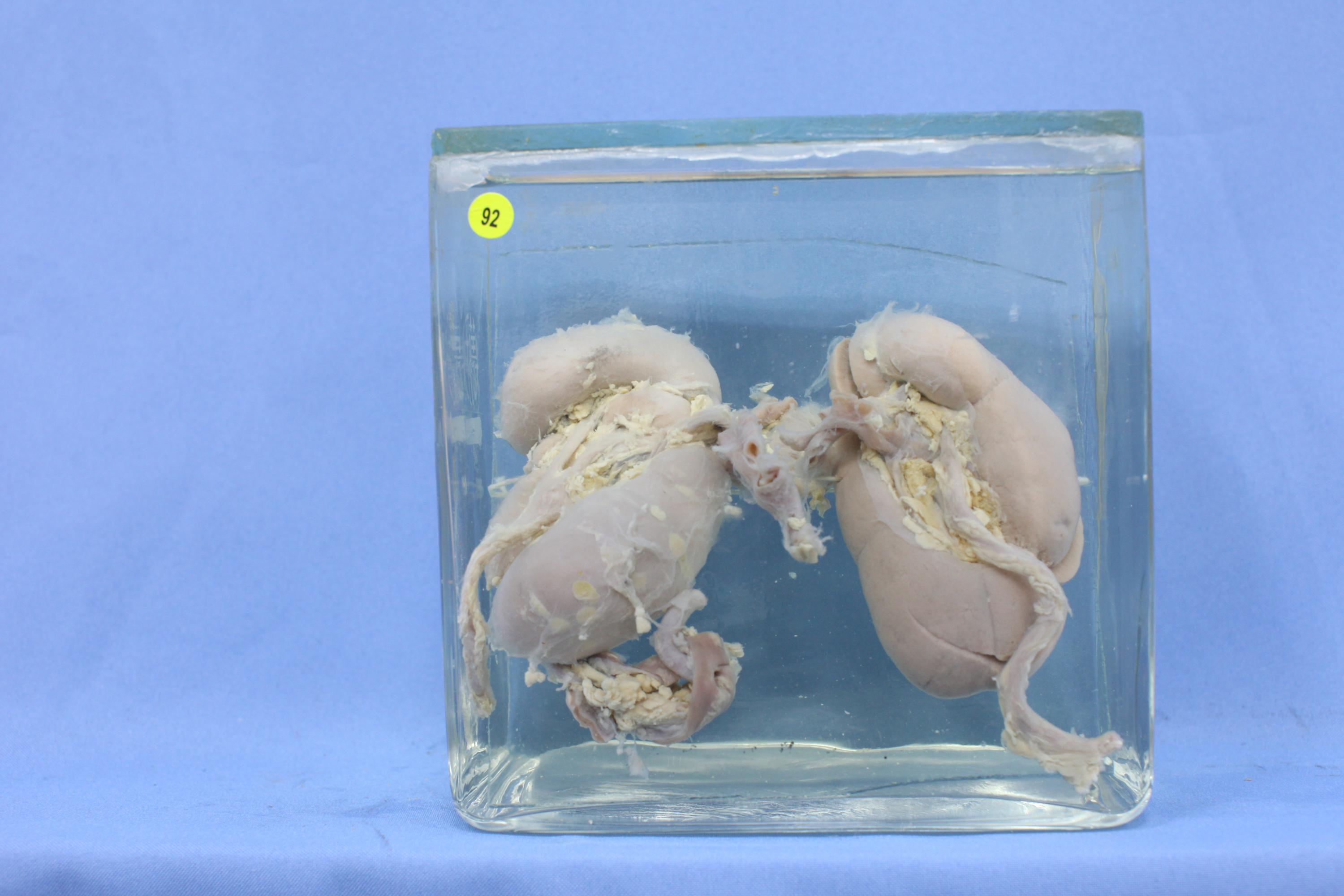 标本见双侧肾脏及输尿管。肾脏外形异常,双肾门位置异常,均向前扭转,血管及输尿管由前方出入。