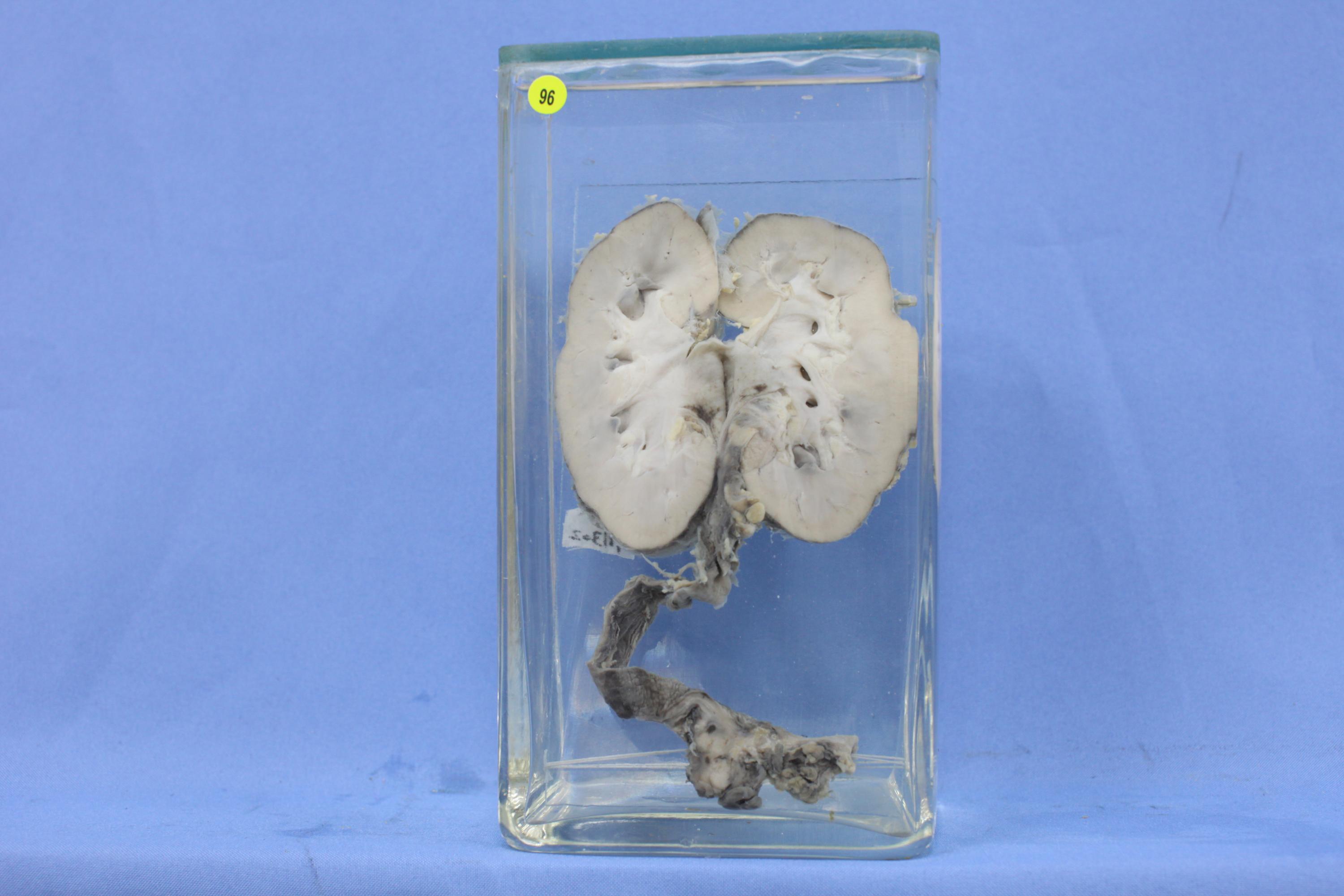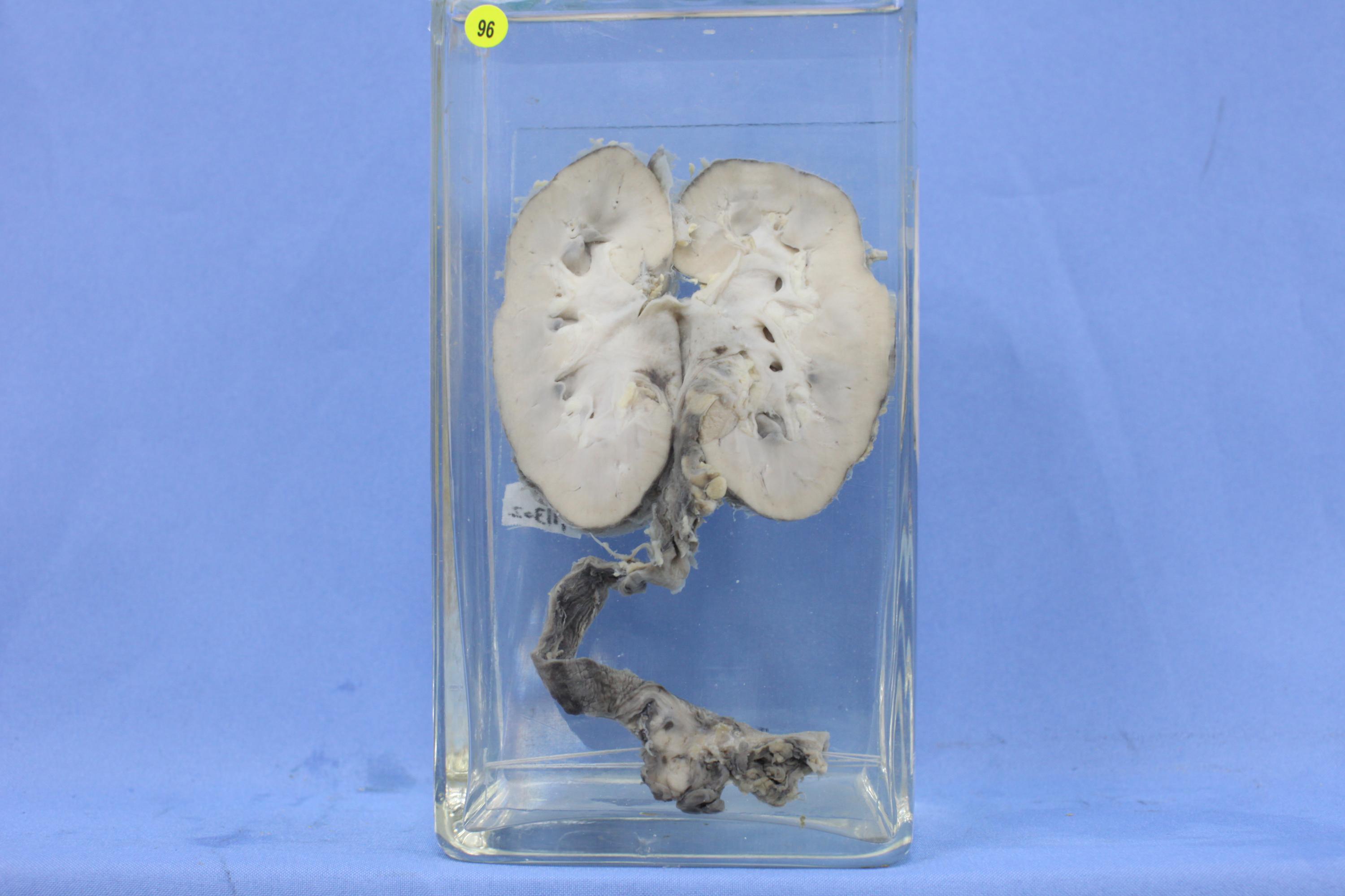 标本示肾脏对开剖面及输尿管,输尿管肾盂粘膜面肥厚、粗糙、淤血,局部输尿管壁有见出血点及淤斑。