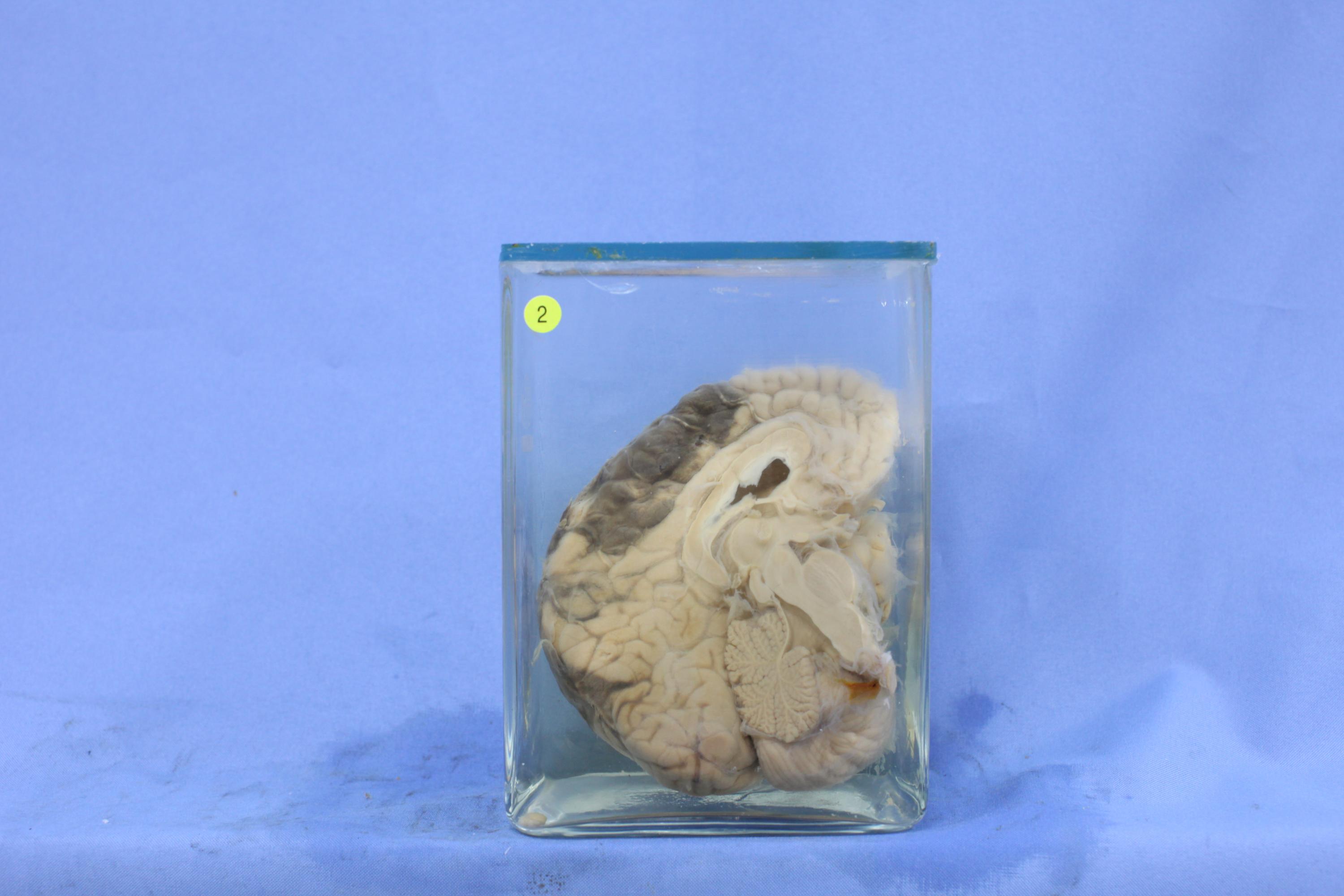 人脑半球矢状切面,左额顶叶蛛网膜下见黑色新鲜血液。
