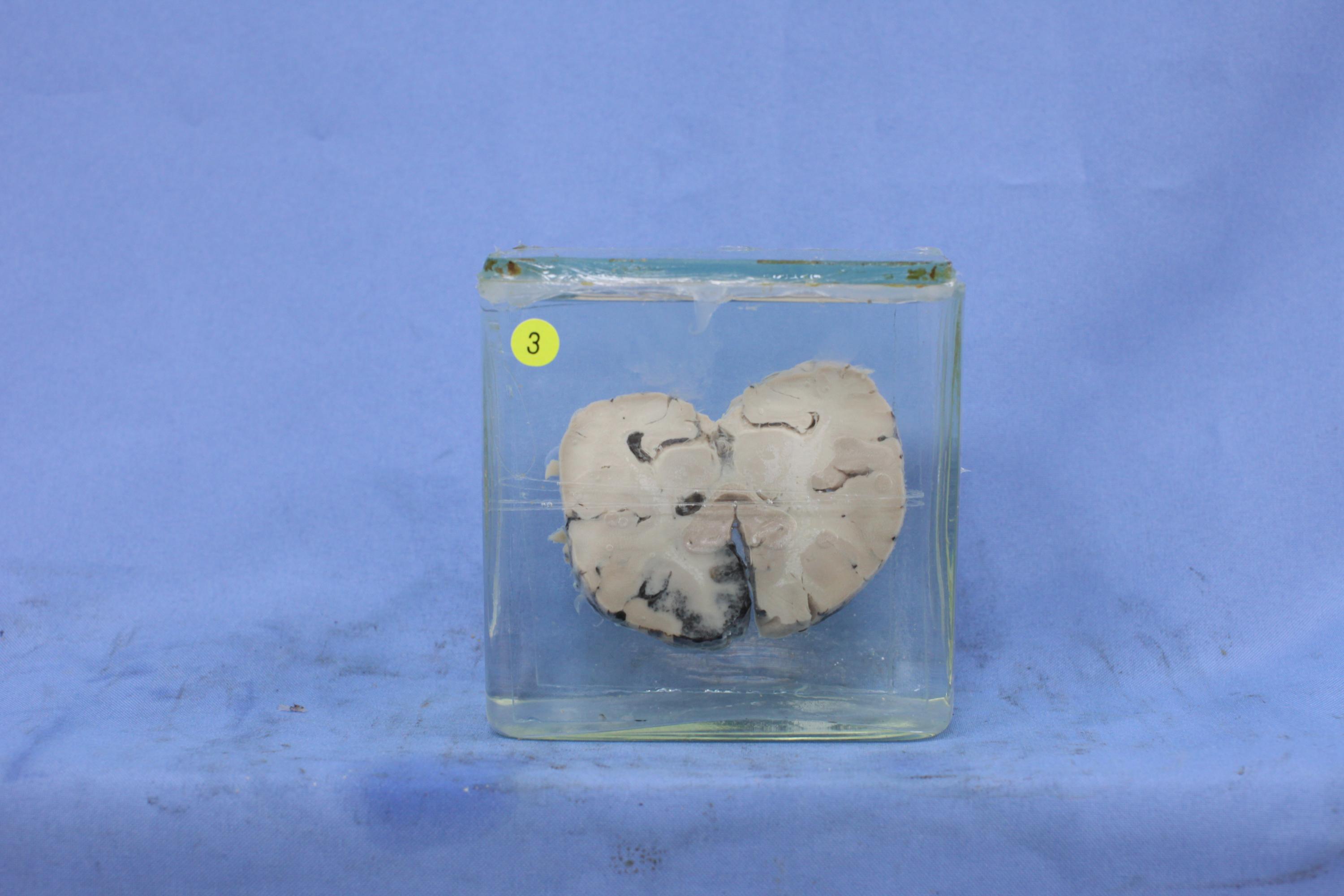 新生儿脑,左顶叶蛛网膜下腔及脑灰质出血,累及侧脑室,经过丘脑的冠状切片。丘脑前小后大,其左侧顶叶表面及矢状沟脑实质表面出血。