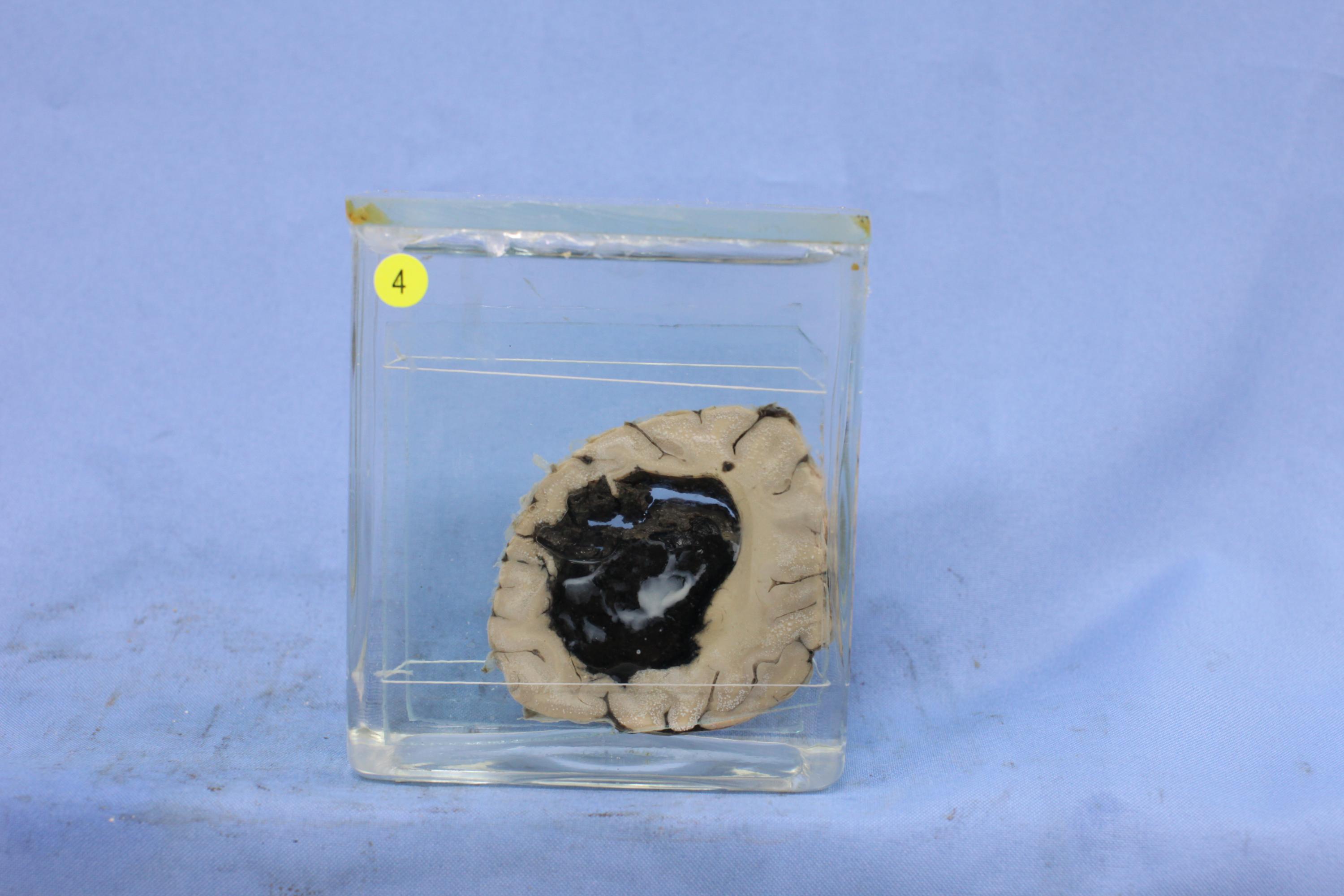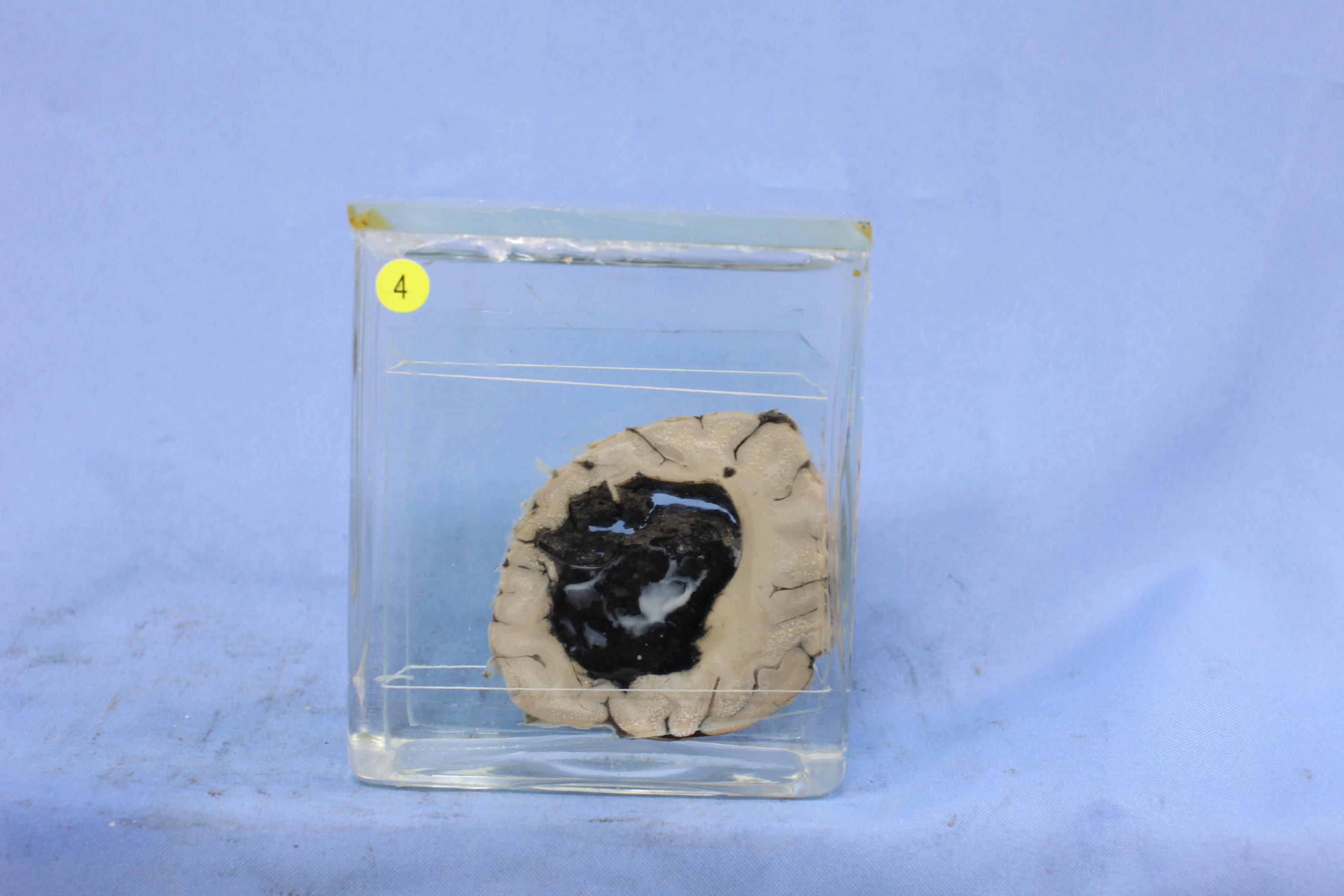 大脑枕叶冠状切面脑组织一块,其侧脑室后角见大量黑色血凝块(白色部分为血浆)伴脑室周围白质破坏。
