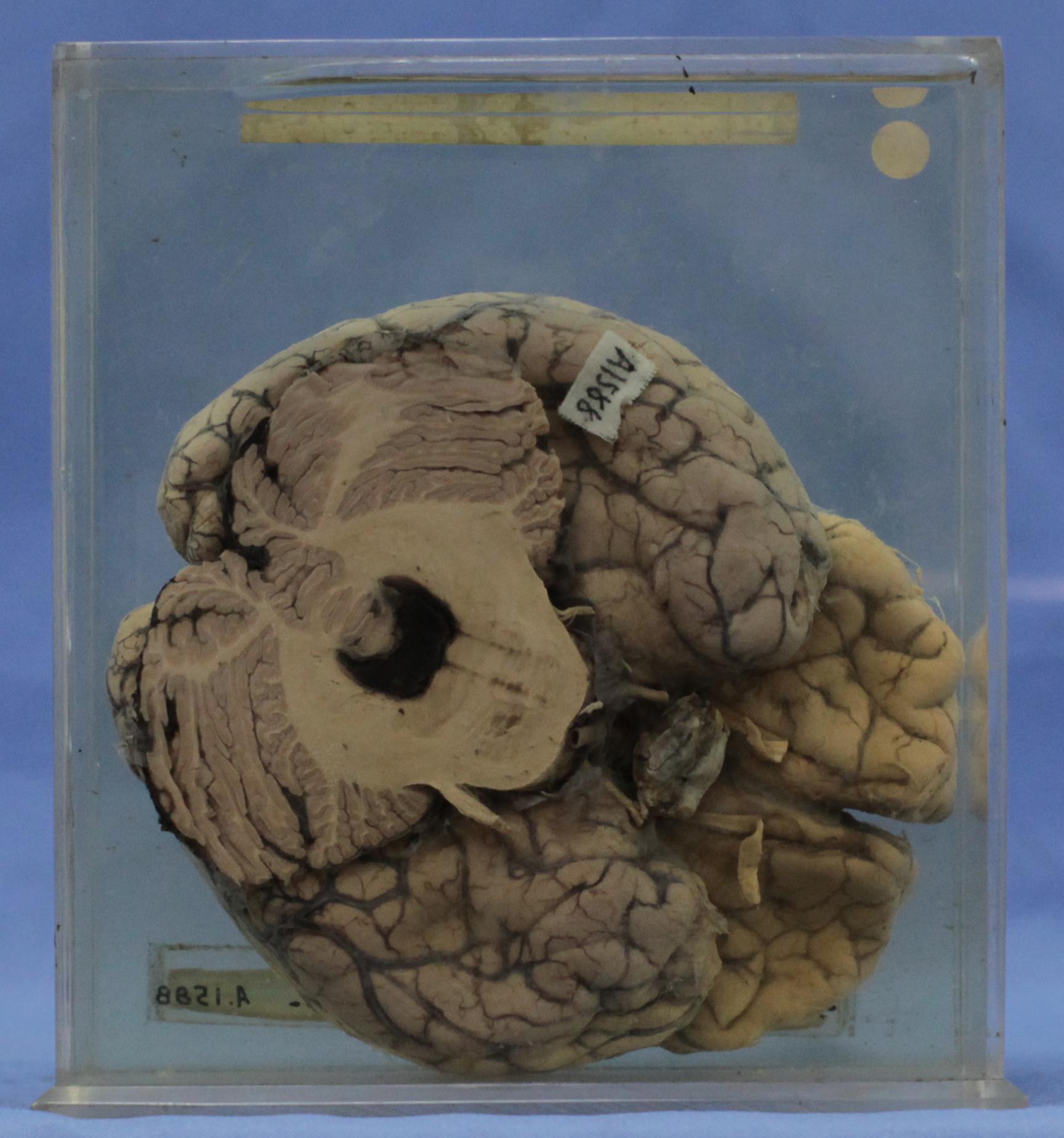 大脑水平切面。右侧丘脑出血,突入脑室,脑基底面小脑第四脑室中见血凝块,并见粥样硬化的中型动脉。