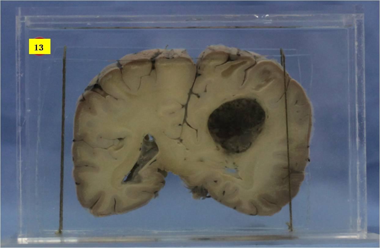 大脑半球经枕叶冠状切面,左侧白质可见5×5cm大充血圆形黑色血病灶一枚,同侧大脑半球肿胀,同侧脑室下脚变小。(为什么?)