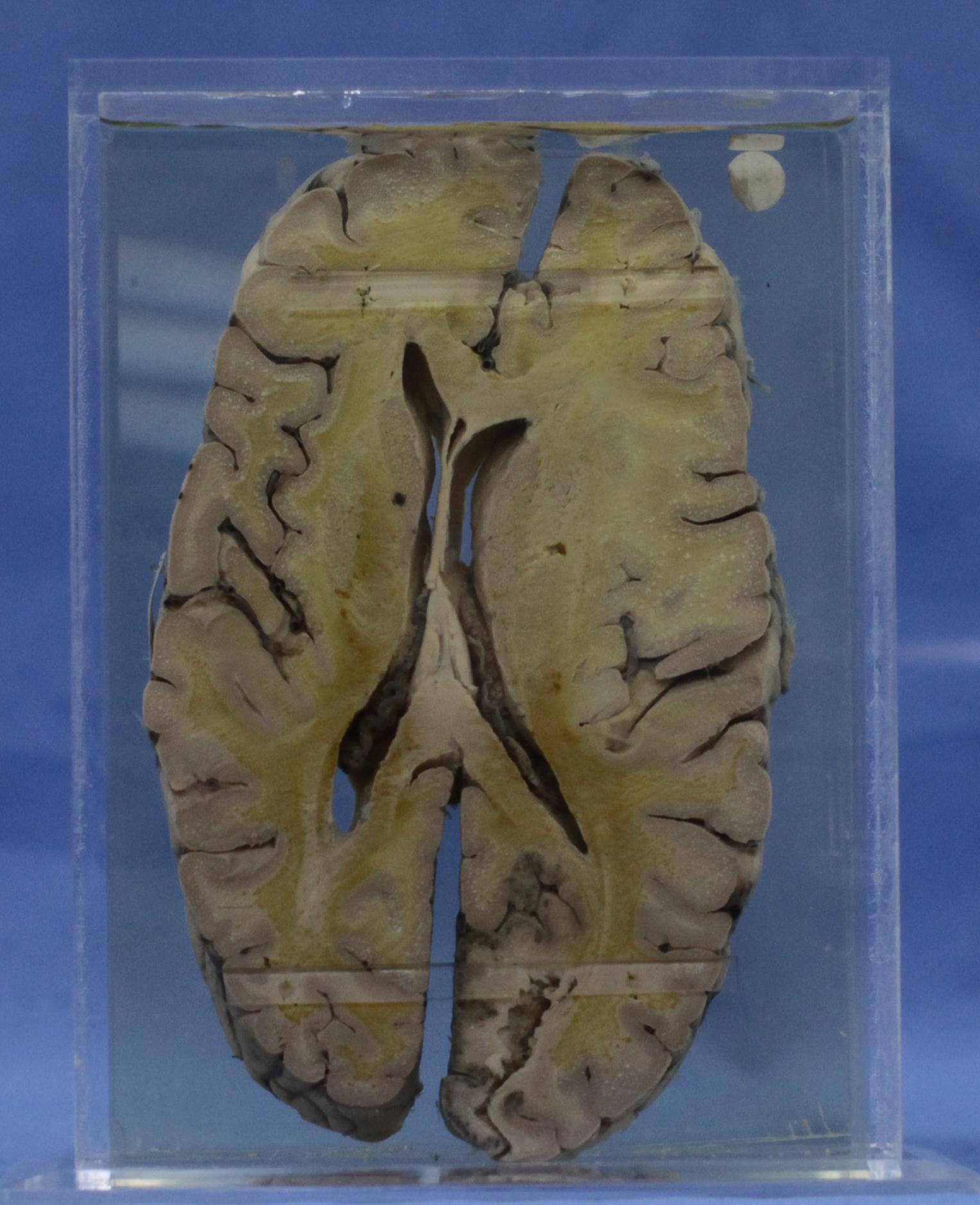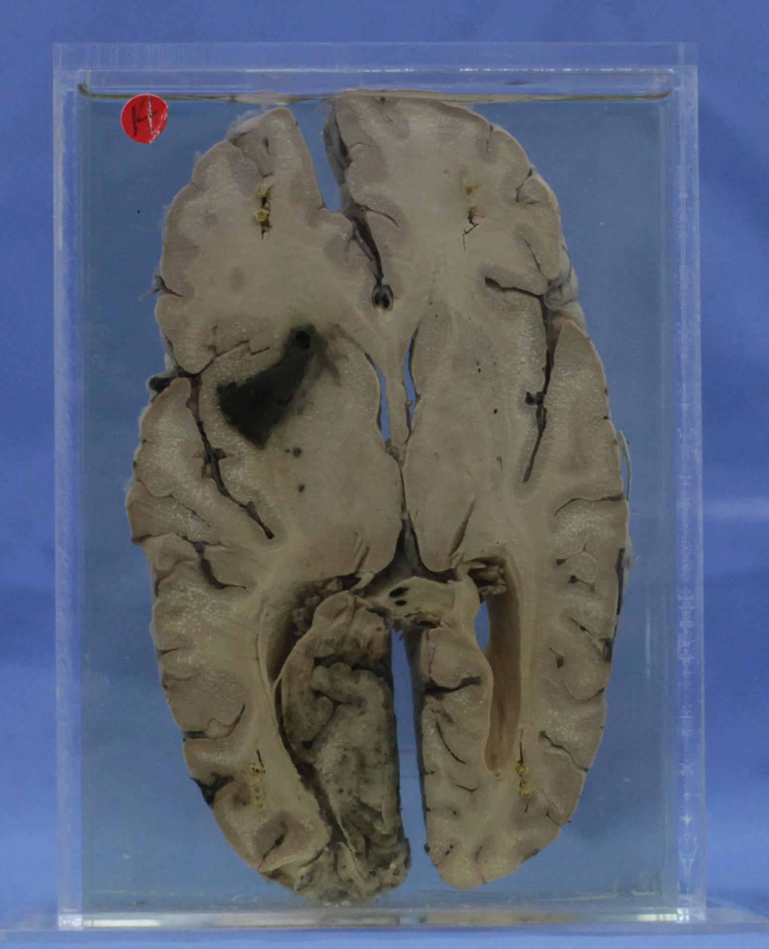 大脑经基底节丘脑水平切面,左侧半球见基底节三角形新鲜出血,同侧侧脑室下脚受挤压变窄,同侧枕叶灰质可见大片足状出血。