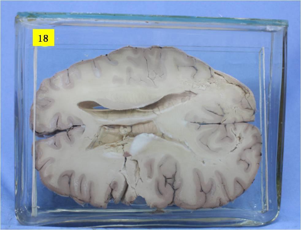 大脑半球水平切面双侧不对称,左侧大脑半球肿大,侧脑室透明隔右移,左侧基底节尾状核及相邻大脑白灰质液化坏死,部分脱落,右侧侧脑室后脚附近及双侧枕叶白质可见灶性液化性坏死。