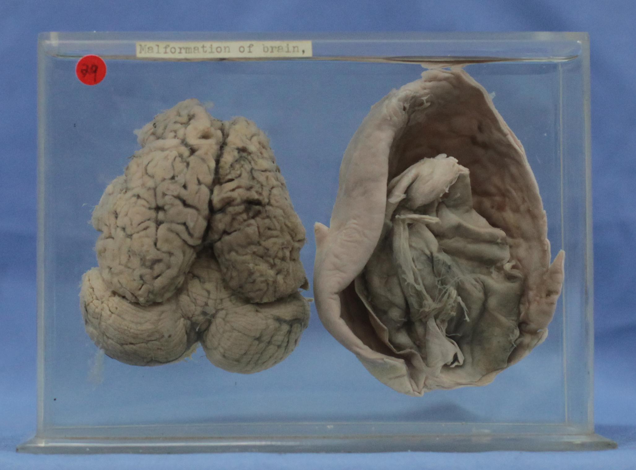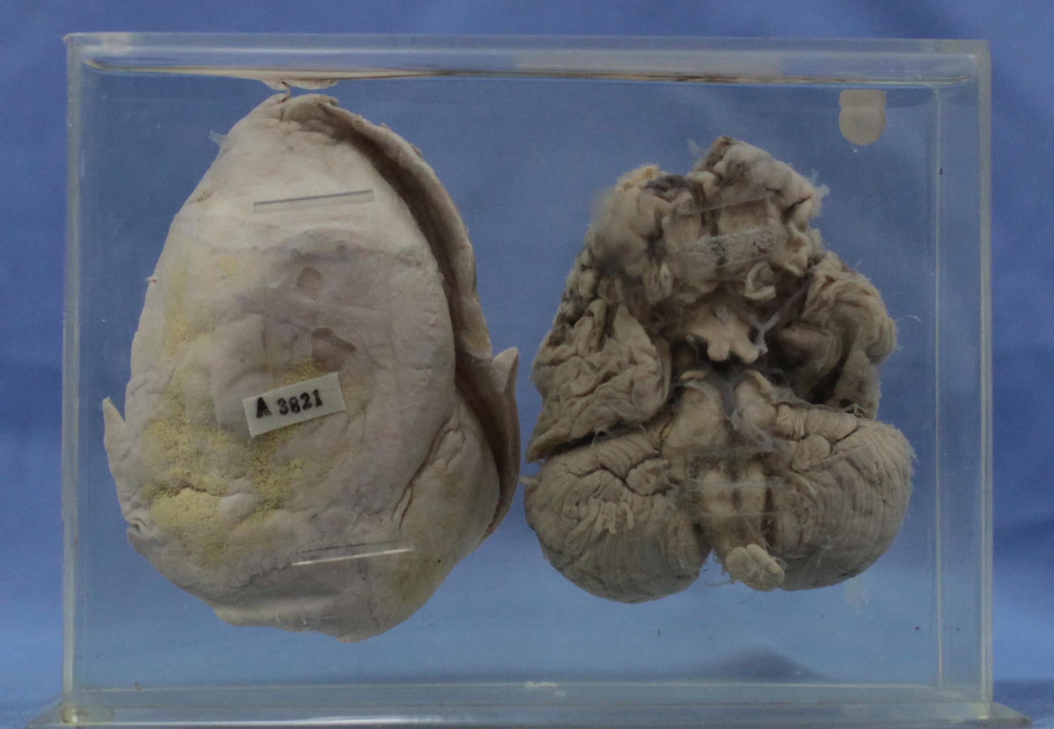 胎儿脑的大脑发育不良(枕叶不能盖住小脑半球),大脑各叶呈不规则、无规律可循的脑沟、脑回分布,右侧为该标本脑膜组织。