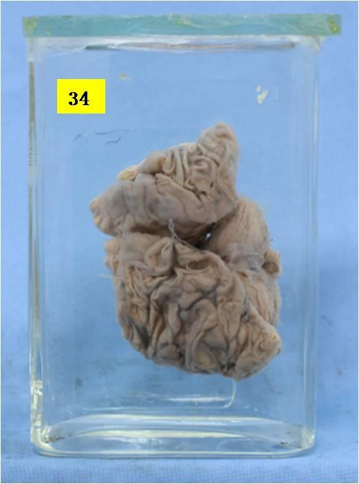 孕30周左右胎儿脑。经基底节的冠状切面,见胎脑白质呈现大小不等多囊状改变。