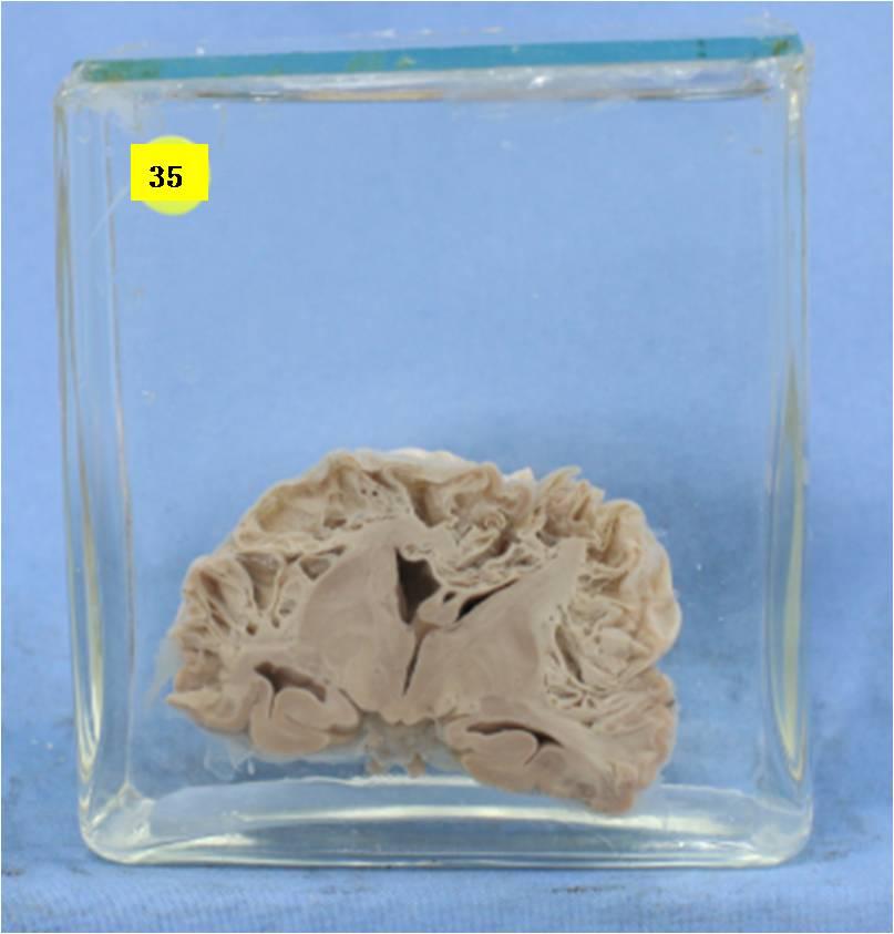 孕30周左右胎儿脑。经丘脑水平冠状切面,切面见胎脑白质呈现大小不等多囊状改变。