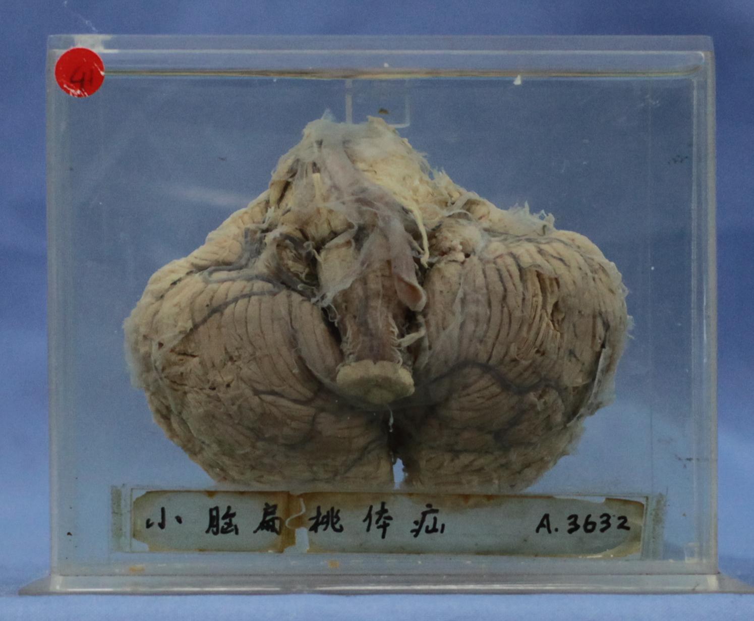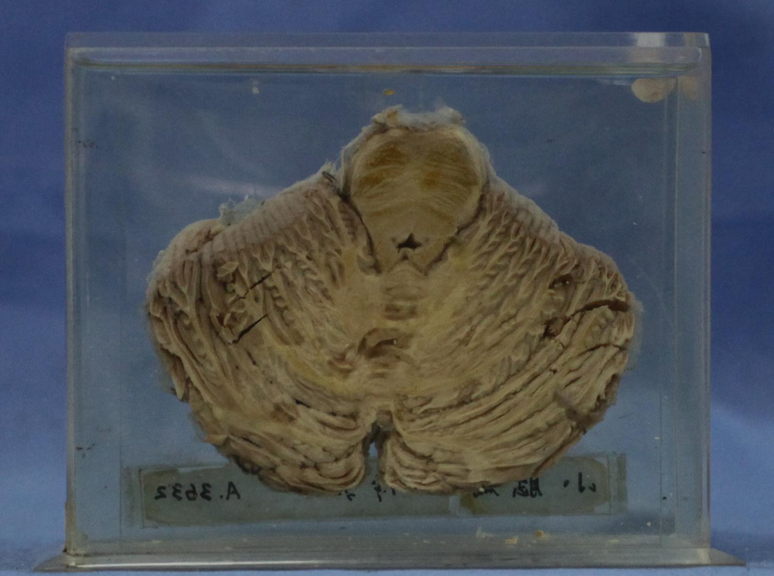 小脑半球和延脑桥脑腹侧面,见小脑扁桃体有一明显压迹,部分小脑贴住延脑,进入枕骨大孔。