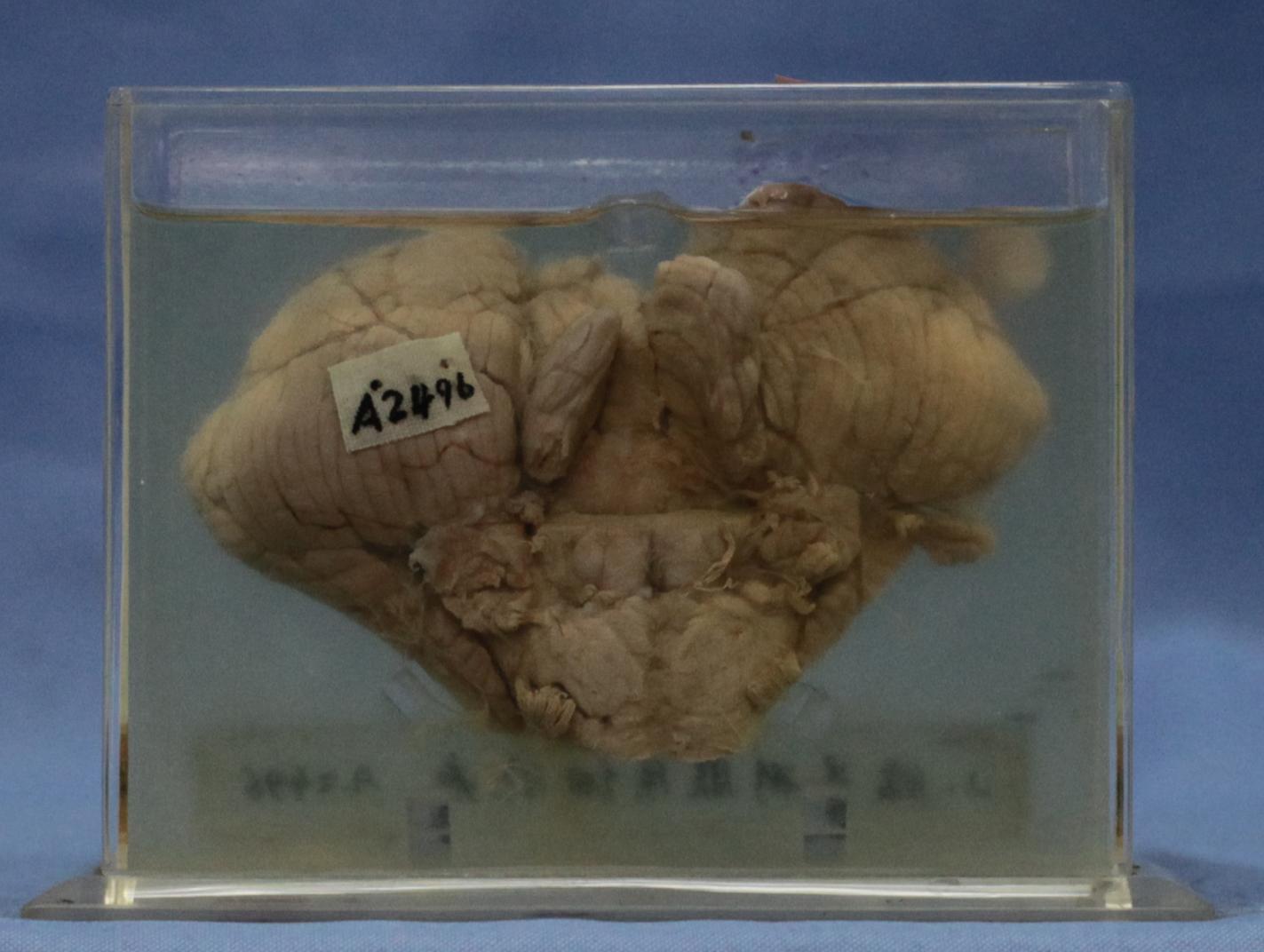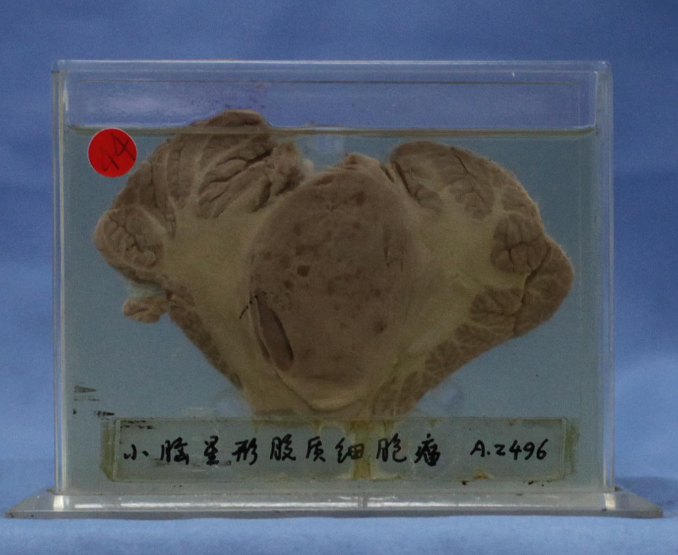 小脑半球水平切面。见小脑中份3*4cm灰红色占位肿块一枚,部分区域与正常组织分界不清,有较多直径为0.1到0.3mm微囊形成,其中最大一个为0.5*2cm,内含胶样物质。
