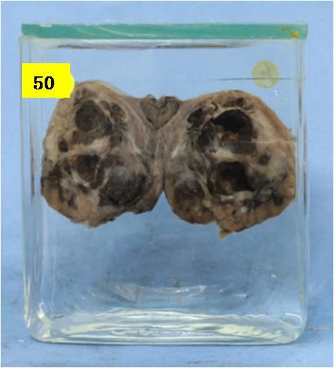 剖面见灰白肿瘤组织,大小5*5*5cm,并见出血囊性变。