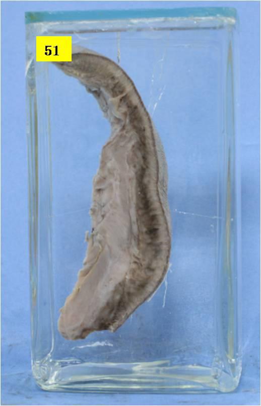 条状头皮及皮下组织一枚,切面见皮下组织呈半透明鱼肉状,皮下黑色素组织中也可见半透明结构。