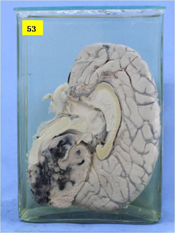 大脑矢切见小脑结构消失,体积增大,切面见出血、坏死,并压迫脑干。腹侧下丘脑漏斗部积水扩大。