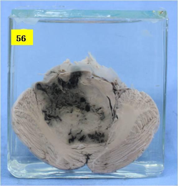 小脑水切见部分小脑被灰白色组织所替代,其中可见出血坏死。