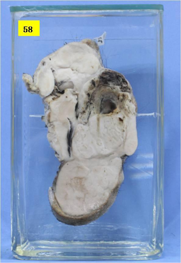 头皮下巨大脂肪肉瘤,部分区域见出血、坏死。